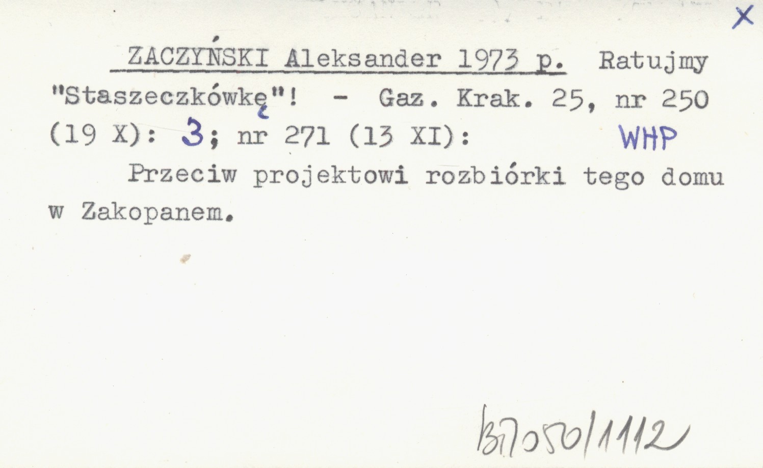 Gazeta Krakowska, 25, nr 250 (19 X): 3; nr 271 (13 XI). Przeciw projektowi rozbiórki tego domu w Zakopanem.