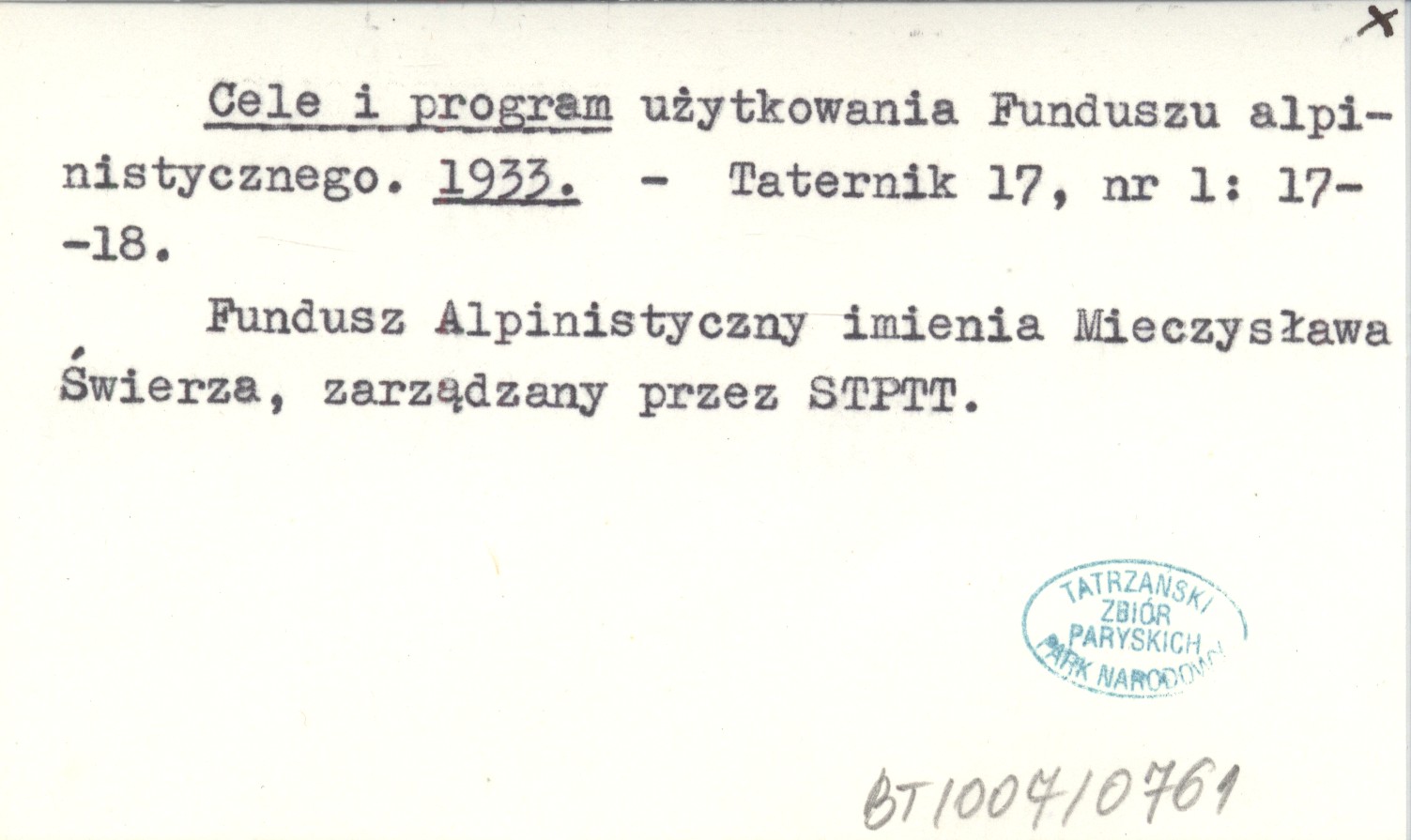 Taternik, 17, nr 1: 17-18. Fundusz Alpinistyczny imienia Mieczysława Świerza, zarządzany przez STPTT.