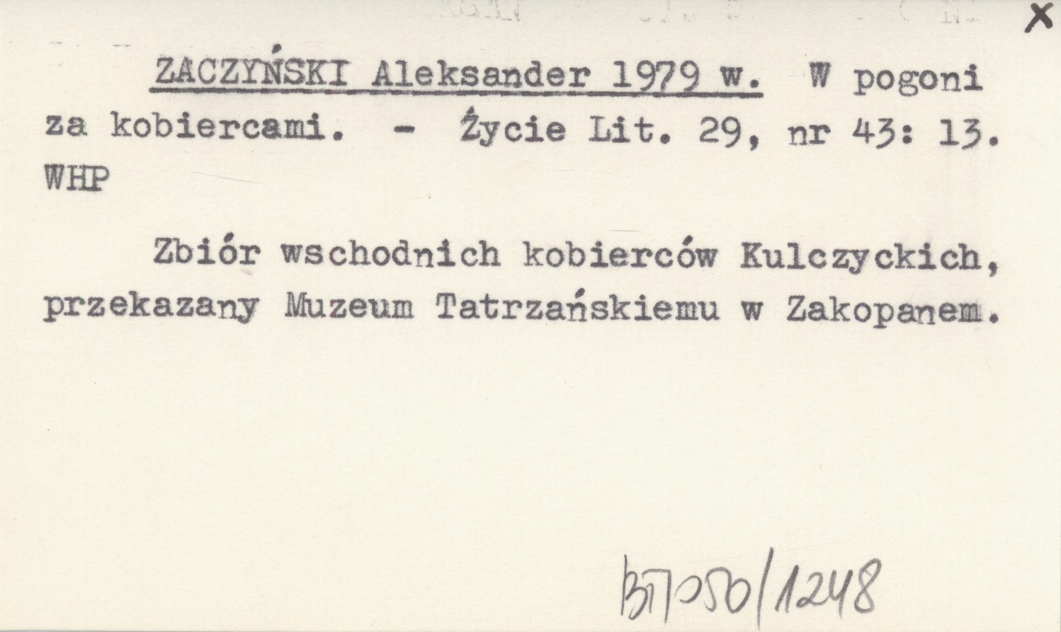 Życie Literackie, 29, nr 43: 13. Zbiór wschodnich kobierców Kulczyckich, przekazany Muzeum Tatrzańskiemu w Zakopanem.