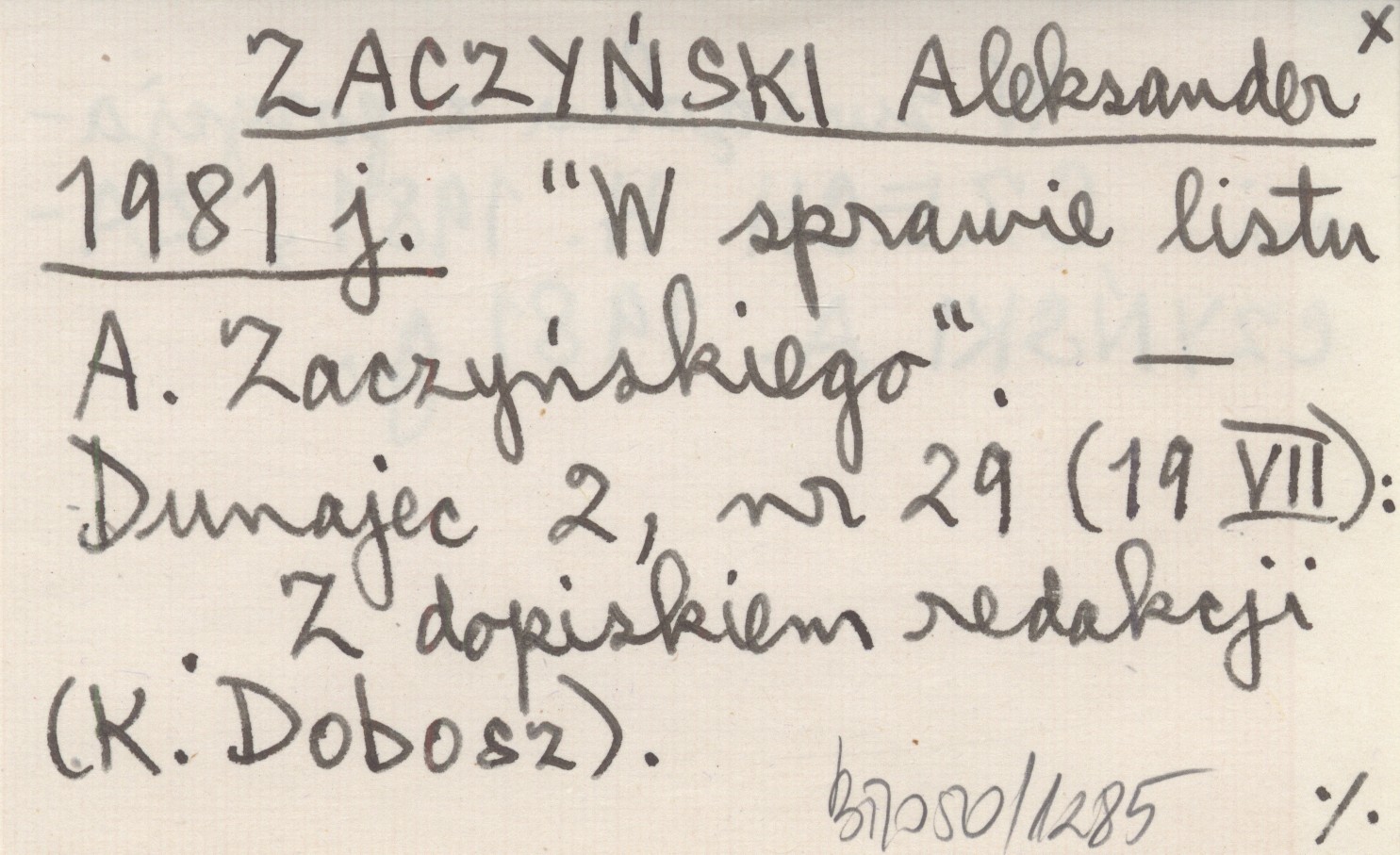 ZACZYŃSKI Aleksander 1981 j "W sprawie listu A. Zaczyńskiego".