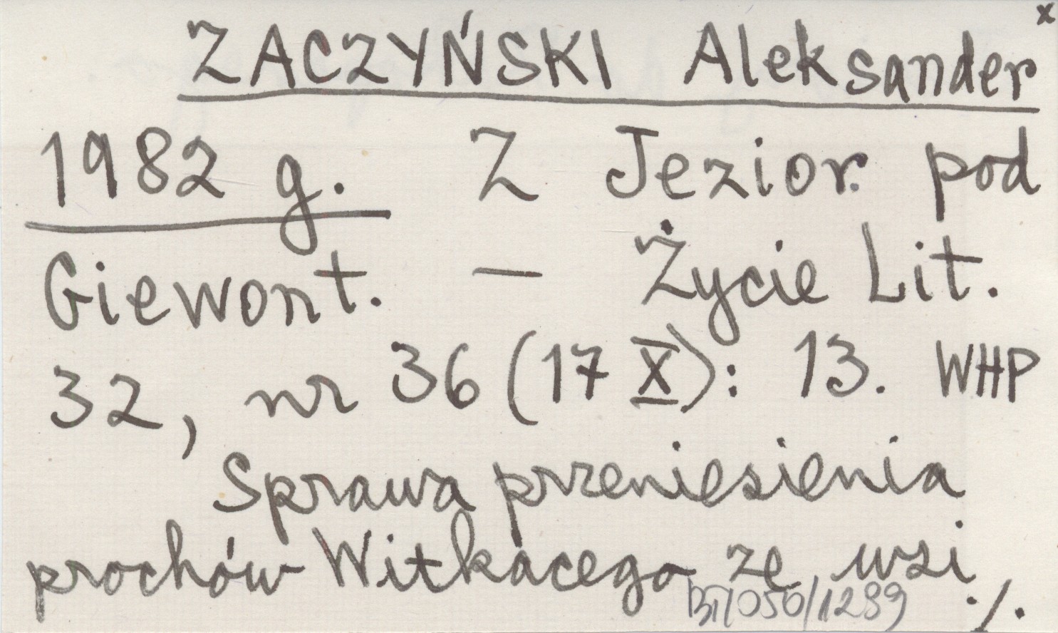 Życie Literackie, 32, nr 36 (17 X): 13. Sprawa przeniesienia prochów Witkacego ze wsi Jeziory do Zakopanego.