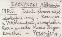 ZACZYŃSKI Aleksander 1985 Jeżeli chcesz mieć spokojne sny... Rozmowa z Aleksandrem Zaczyńskim. Rozmawiała Maria Szyszkowska.