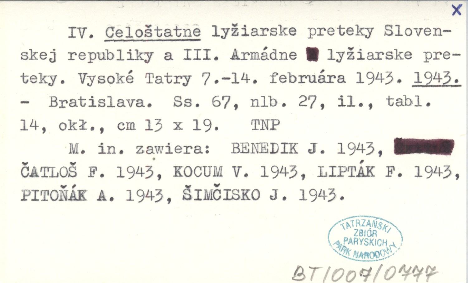IV. Celoštatne lyžiarske preteky Slovenskej republiky a III. Armádne lyžiarske preteky. Vysoké Tatry 7.-14. februára 1943. 1943
