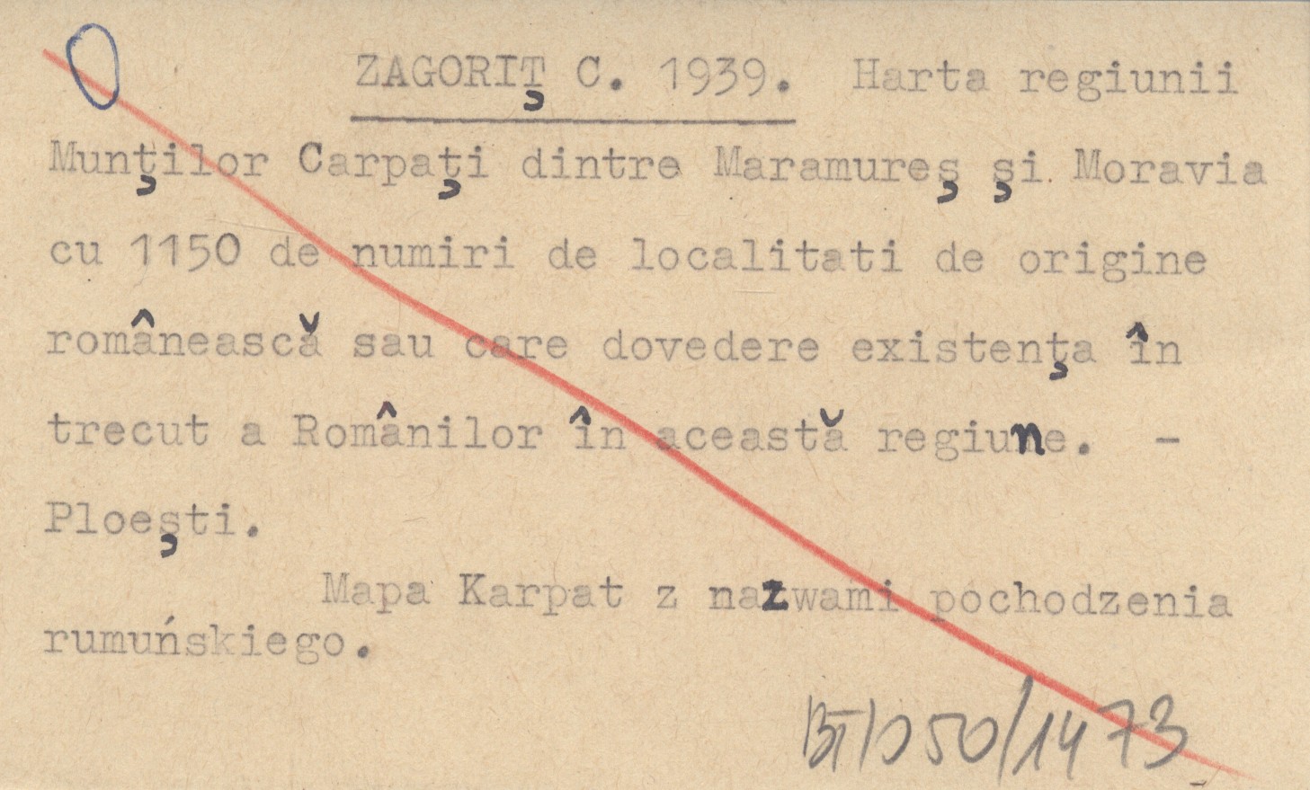 ZAGORIȚ C. 1939 Harta regiunii Munților Carpați dintre Maramureș și Moravia cu 1150 de numiri de localitati de origine românească sau care dovedere existența în trecut a Românilor în această regiune.