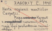 ZAGORIŢ C. 1939 Harta regiunii Munţilor Carpaţi dintre Maramureş şi Moravia cu 1150 de numiri de localitati de origine românească sau care dovedere existenţa în trecut a Românilor în această regiune.