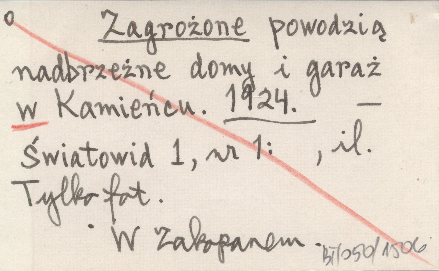 Zagrożone powodzią nadbrzeżne domy i garaż w Kamieńcu. 1924