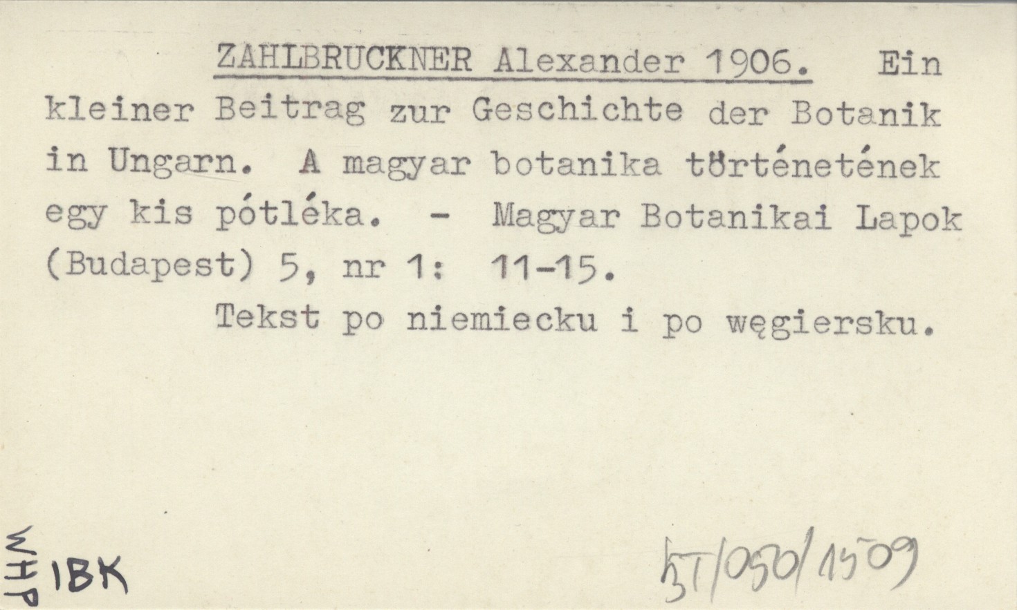 ZAHLBRUCKNER Alexander 1906 Ein kleiner Beitrag zur Geschichte der Botanik in Ungarn. A magyar botanika történetének egy kis pótléka.