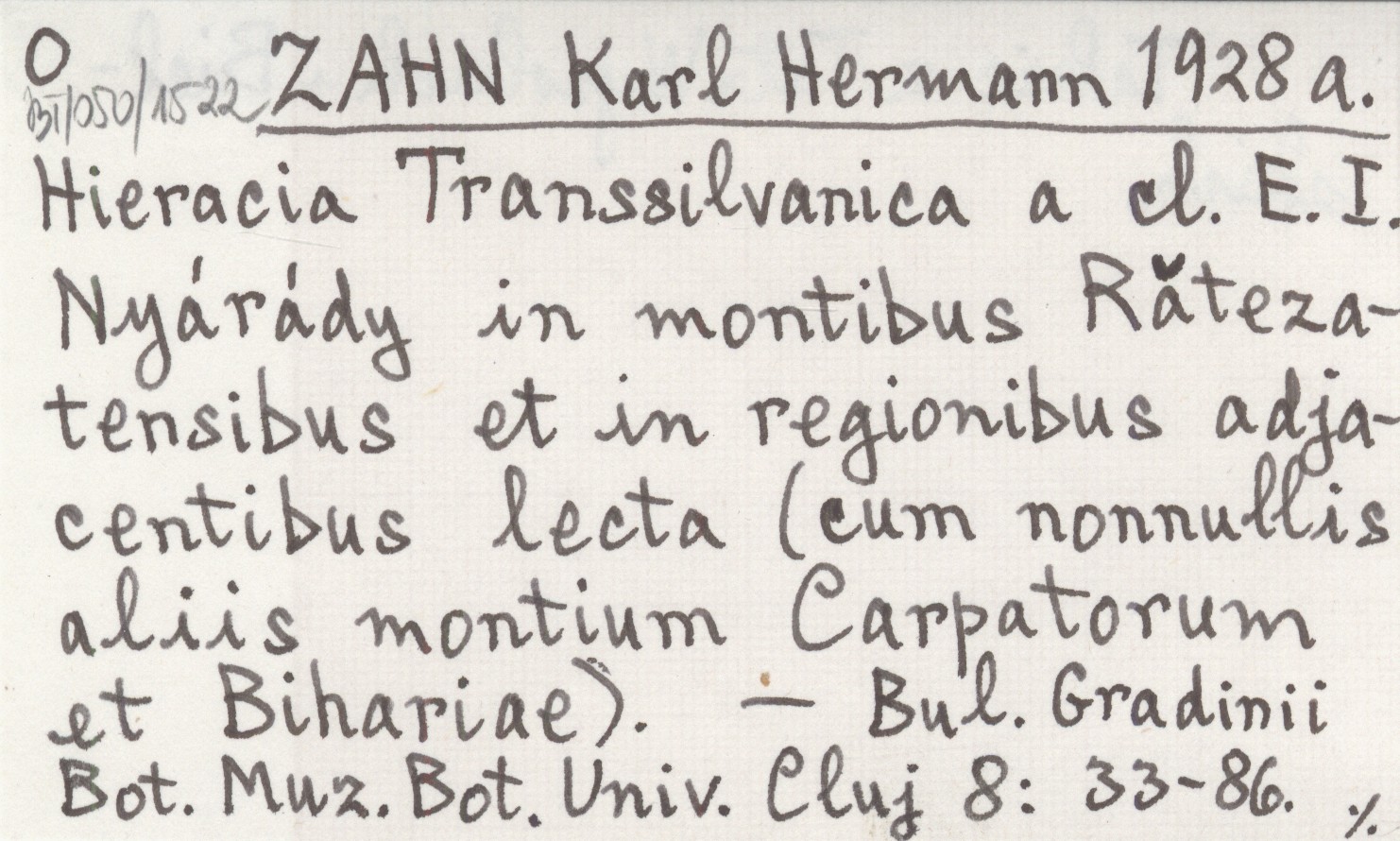 ZAHN Karl Hermann 1928 a Hieracia Transsilvanica a cl. E. i. Nyárády in montibus Rătezatensibus et in regionibus adjacentibus lecta (cum nonnullis aliis montium Carpatorum et Bihariae).