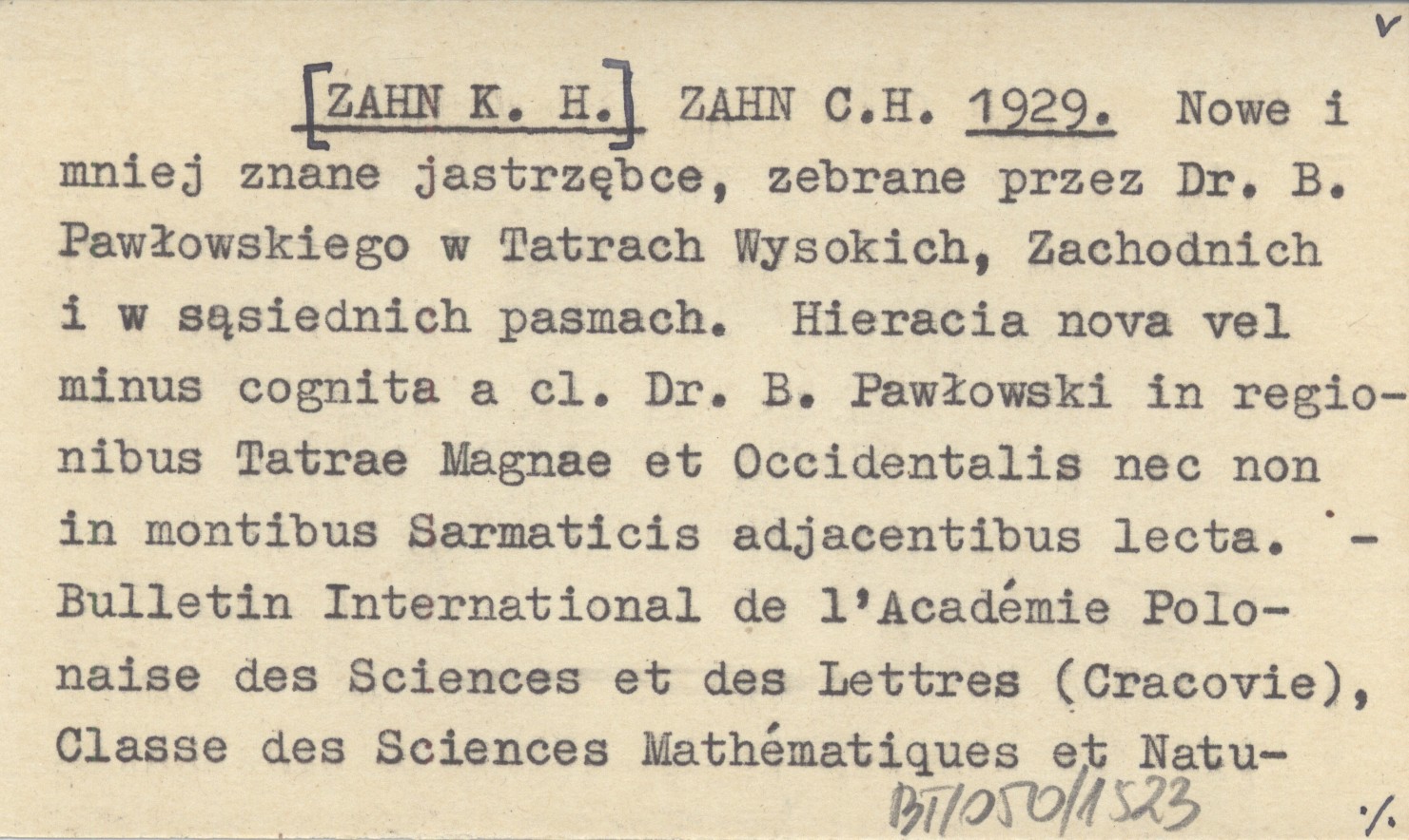 ZAHN C. H. [ZAHN K. H.] 1929 Nowe i mniej znane jastrzębce, zebrane przez Dr. B. Pawłowskiego w Tatrach Wysokich, Zachodnich i w sąsiednich pasmach. Hieracia nova vel minus cognita a cl. Dr. B. Pawłowski in regionibus Tatrae Magnae et Occidentalis nec non in montibus Sarmaticis adjacentibus lecta.