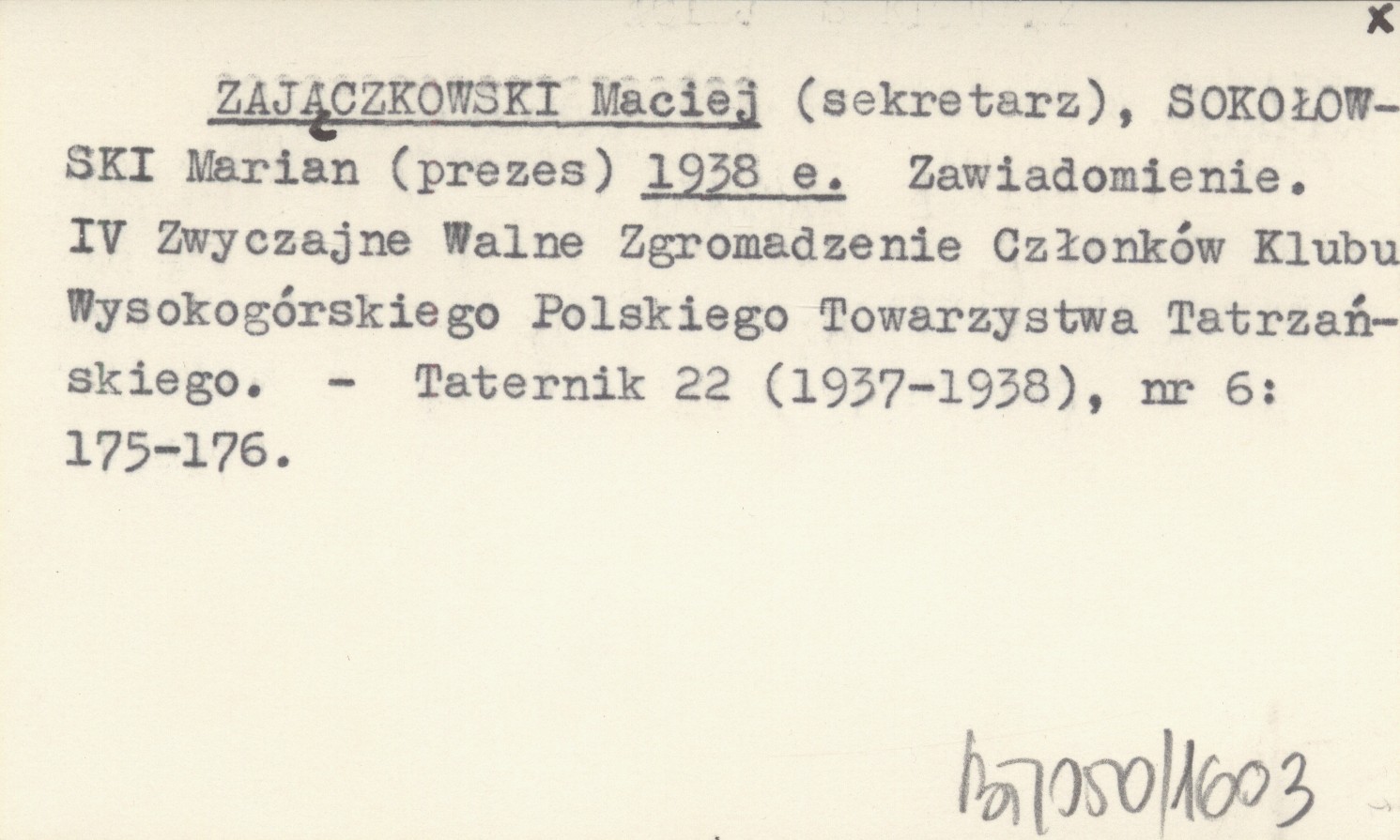 ZAJĄCZKOWSKI Maciej SOKOŁOWSKI, Marian. ; 1938 e Zawiadomienie. IV Zwyczajne Walne Zgromadzenie Członków Klubu Wysokogórskiego Polskiego Towarzystwa Tatrzańskiego.