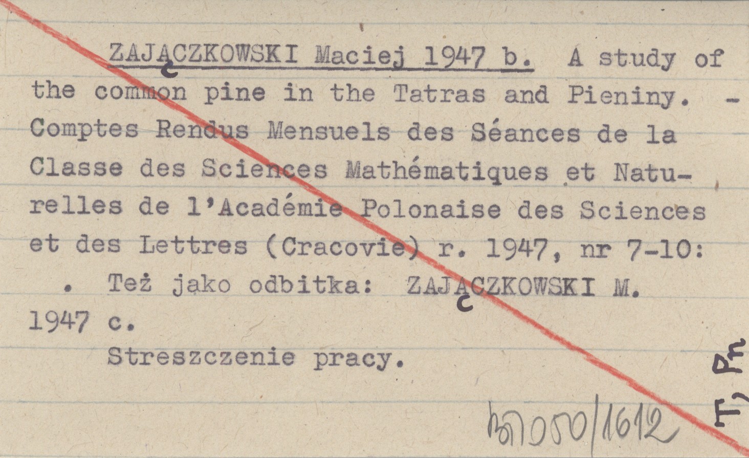 Comptes Rendus Mensuels des Séances de la Classe des Sciences Mathématiques et Naturelles de l'Académie Polonaise des Sciences et des Lettres (Cracovie) , Nr 7-10. Też jako odbitka: ZAJĄCZKOWSKI M. 1947 c. Streszczenie pracy.