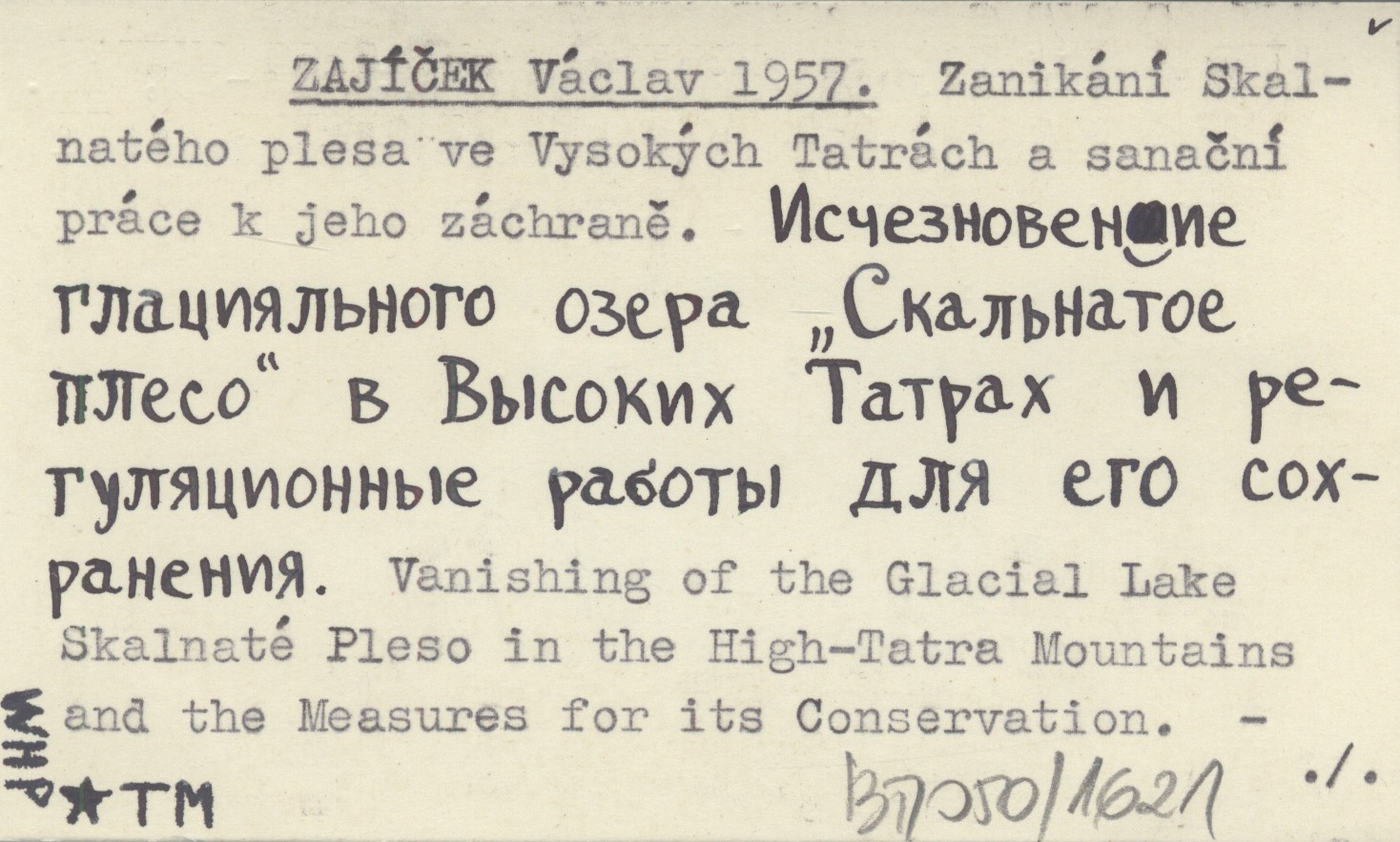 ZAJÍČEK Václav 1957 Zanikání Skalnatého plesa ve Vysokých Tatrách a sanační práce k jeho záchraně. Izczeznovenie glacijal'nogo ozera "Skal'natoe pleso" v Vysokich Tatrach i reguljacionnye raboty dlja ego sochranenija. Vanishing of the Glacial Lake Skalnaté Pleso in the High-Tatra Mountains and the Measures for its Conservation.