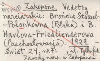 Zakopane. Vedetty narciarskie: Brońcia Staszel-Polonkówna (Polska) i B. Havlova-Friedlienderowa (Czechosłowacja). 1929