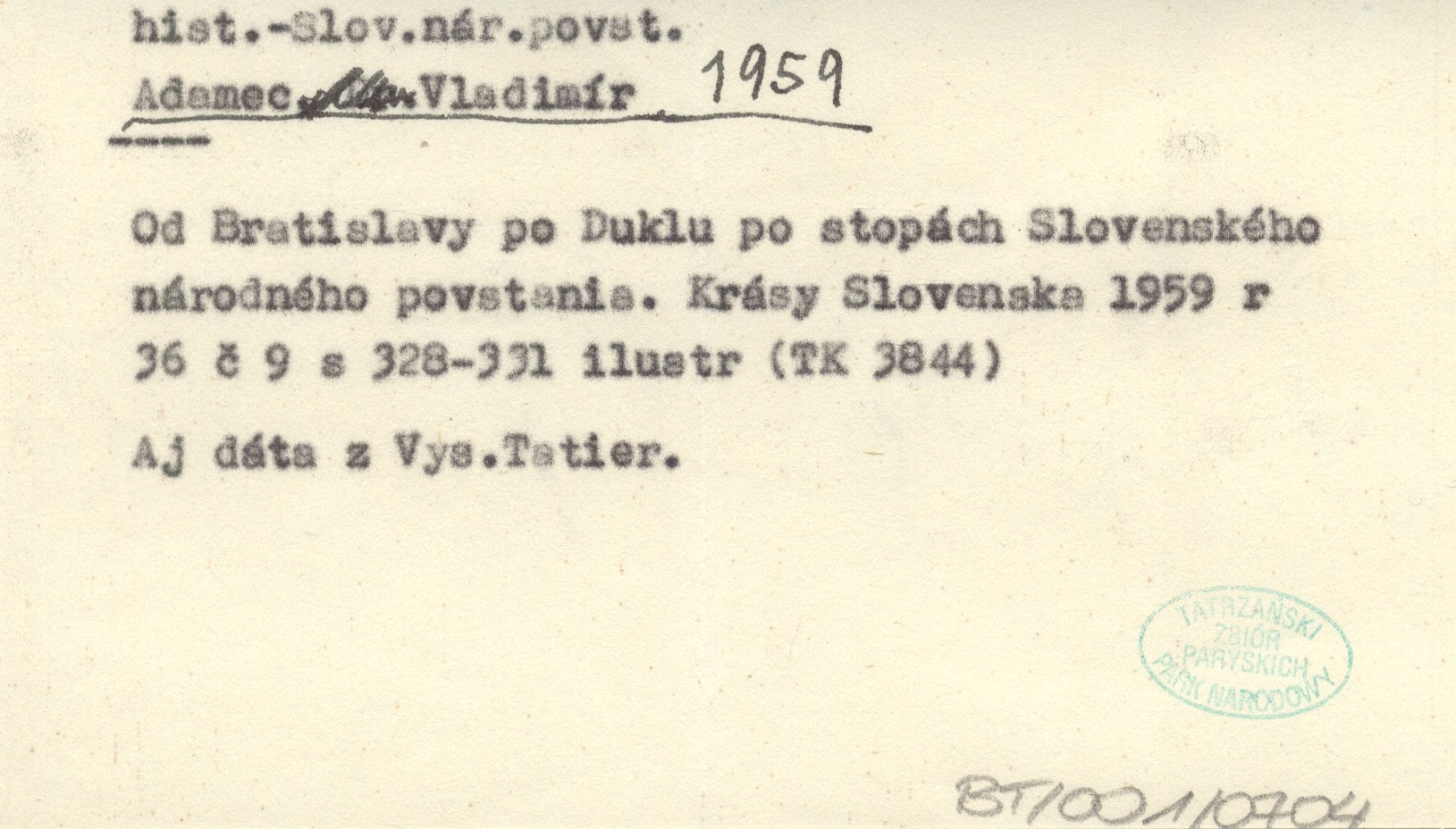 Krásy Slovenska, R. 36, nr 9: 328-331. hist.-Slov. nár. povst. ; Aj dáta z Vys. Tatier.