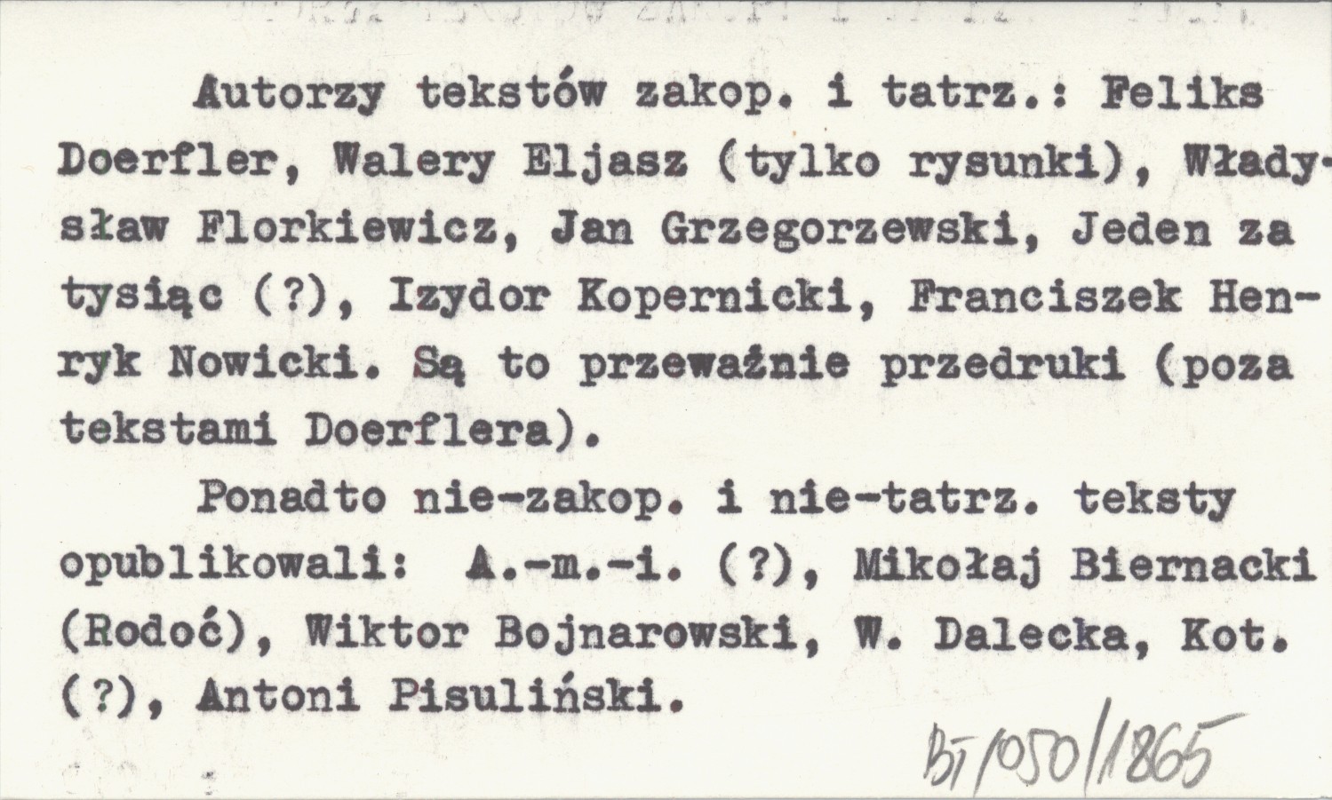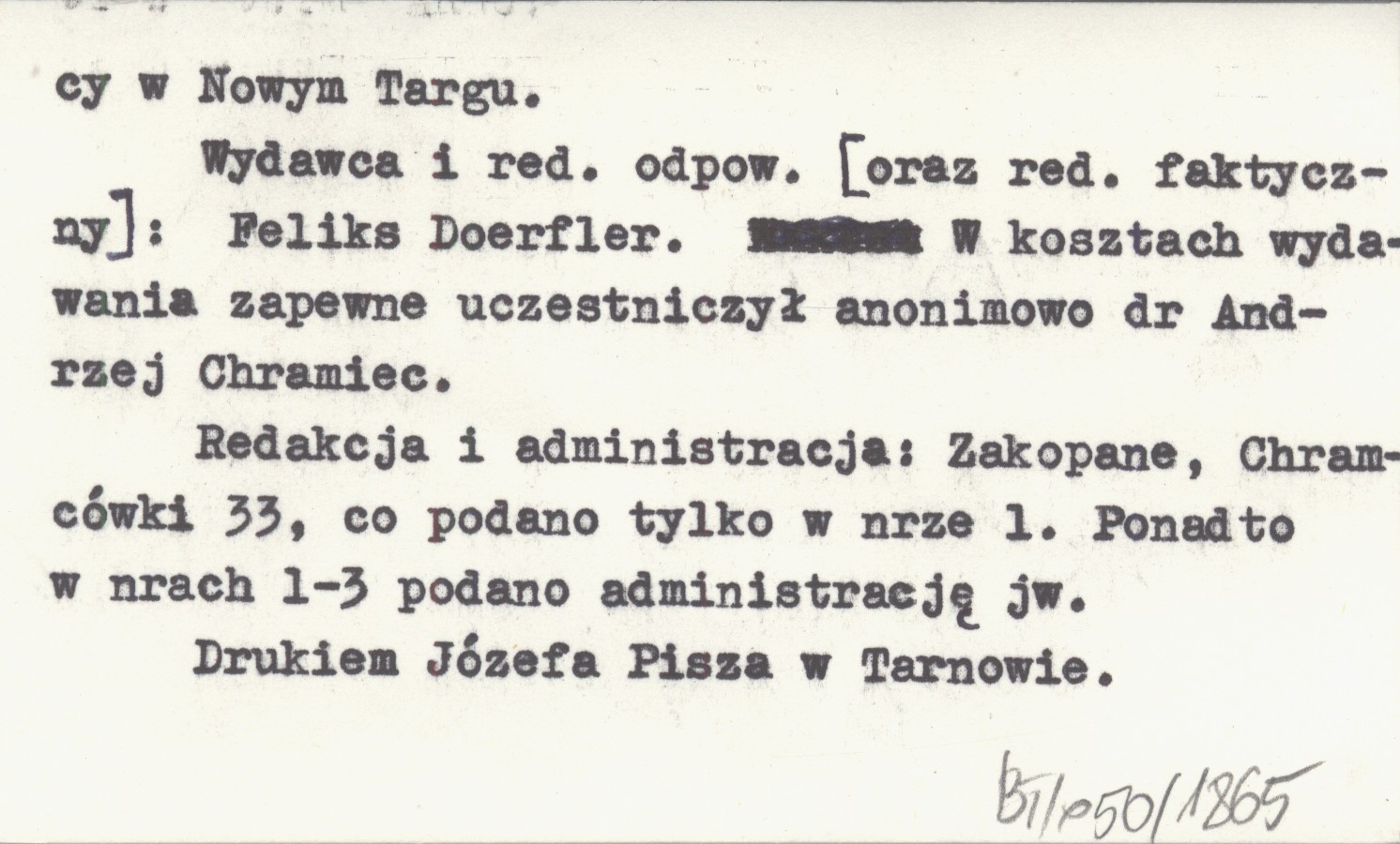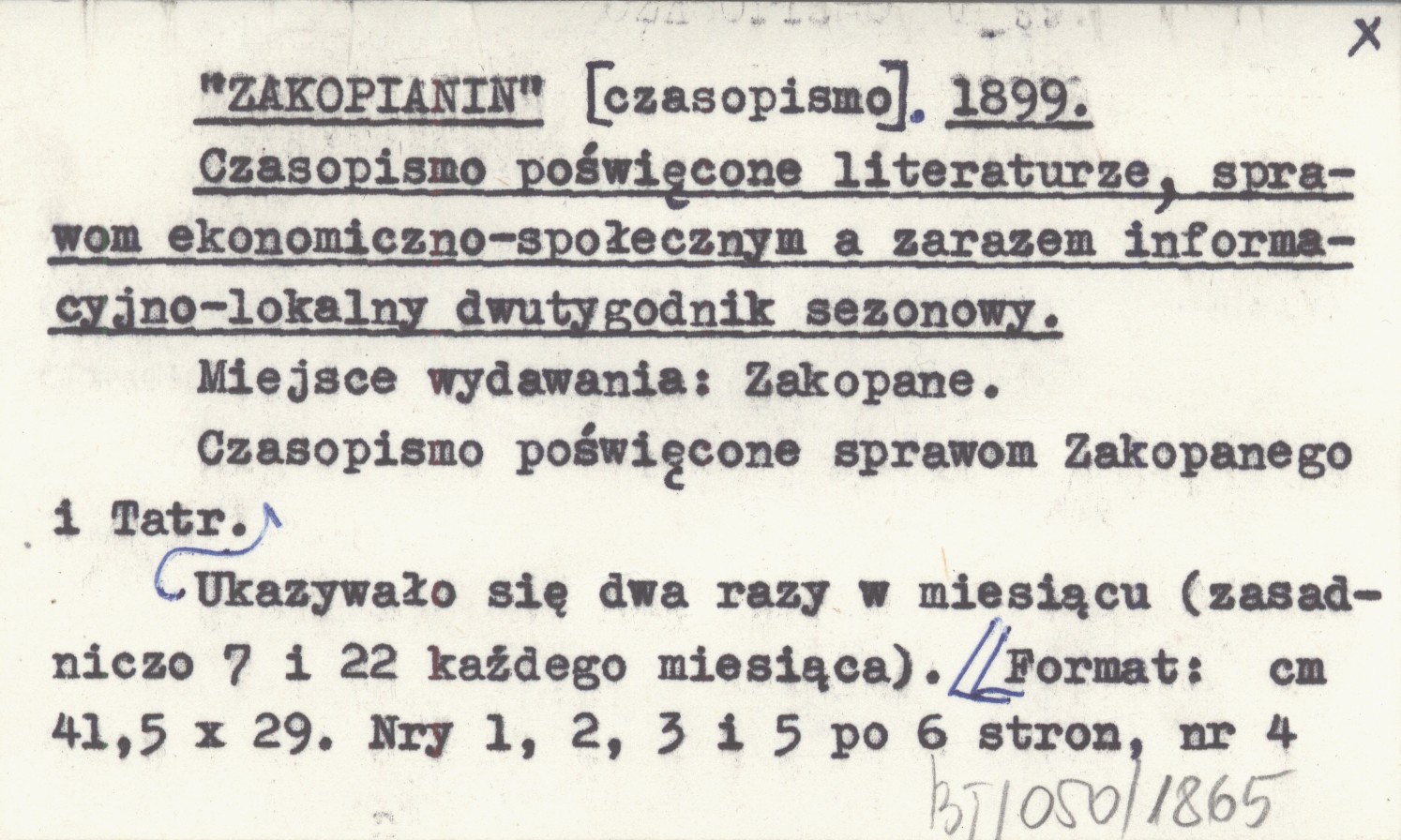 Zakopianin (Zakopane) , R I, nr 1 (22 VI), 6 s. ; nr 2 (7 VII), 6 s. ; nr 3 (22 VII), 6 s. ; nr 4 (7 VIII), 8 s. ; nr 5 (22 VIII), 6 s. ; nr 6 (10 IX), 4 s. ; il, 42x29 cm. Czasopismo poświęcone literaturze, sprawom ekonomiczno-społecznym a zarazem informacyjno-lokalny dwutygodnik sezonowy. Czasopismo poświęcone sprawom Zakopanego i Tatr. Ukazywało się dwa razy w miesiącu (zasadniczo 7i 22 każdego miesiąca). Każdy nr z ozdobnym tytułem oraz winietą Walerego Eljasza: góral na skale i orzeł na tle Tatr i wstęga z napisem: "W góry, w góry, miły bracie. Tam swoboda czeka na cię". Jest to rycina powtórzona z okładki "Pamiętnika Towarzystwa Tatrzańskiego" z r. 1876. Jako dodatek abonenci mieli otrzymywać bezpłatnie dwutygodnik "Podhalanin", wychodzący w Nowym Targu. W kosztach wydania uczestniczył anonimowo dr Andrzej Chramiec. Redakcja i administracja: Zakopane, Chramcówki 33, co podano tylko w nr 1. Ponadto w nr 1-3 podano administrację jw. Drukiem Jóżefa Pisza w Tarnowie. Autorzy tekstów zakopiańskich i tatrzańskich: Feliks Doerfler, Walery Eljasz (tylko rysunki), Władysław Florkiewicz, Jan Grzegorzewski, Jeden za tysiąc (?), Izydor Kopernicki, Franciszek Henryk Nowicki. Są to przeważnie przedruki (poza tekstami Doerflera). Ponadto nie-zakopiańskie i nie-tatrzańskie teksty opublikowali: A.-m.-i. (?), Mikołaj Biernacki (Rodoć), Wiktor Bojnarowski, W. Dalecka, Kot. (?), Antoni Pisuliński.