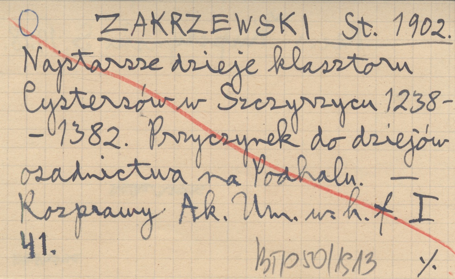 ZAKRZEWSKI St. 1902 Najstarsze dzieje klasztoru Cystersów w Szczyrzycu 1238-1382. Przyczynek do dziejów osadnictwa na Podhalu.