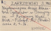 ZAKRZEWSKI S. 1902 Najdawniejsze dzieje klasztoru Cystersów w Szczyrzycu.