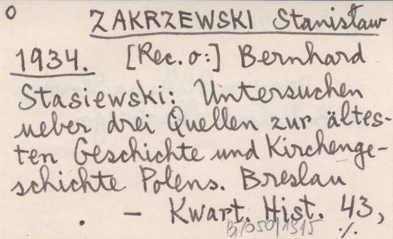 ZAKRZEWSKI Stanisław 1934 [Rec. o:] Bernhard Stasiewski: Untersuchen ueber drei Quellen zur ältesten Geschichte und Kirchengeschichte Polens. Breslau.