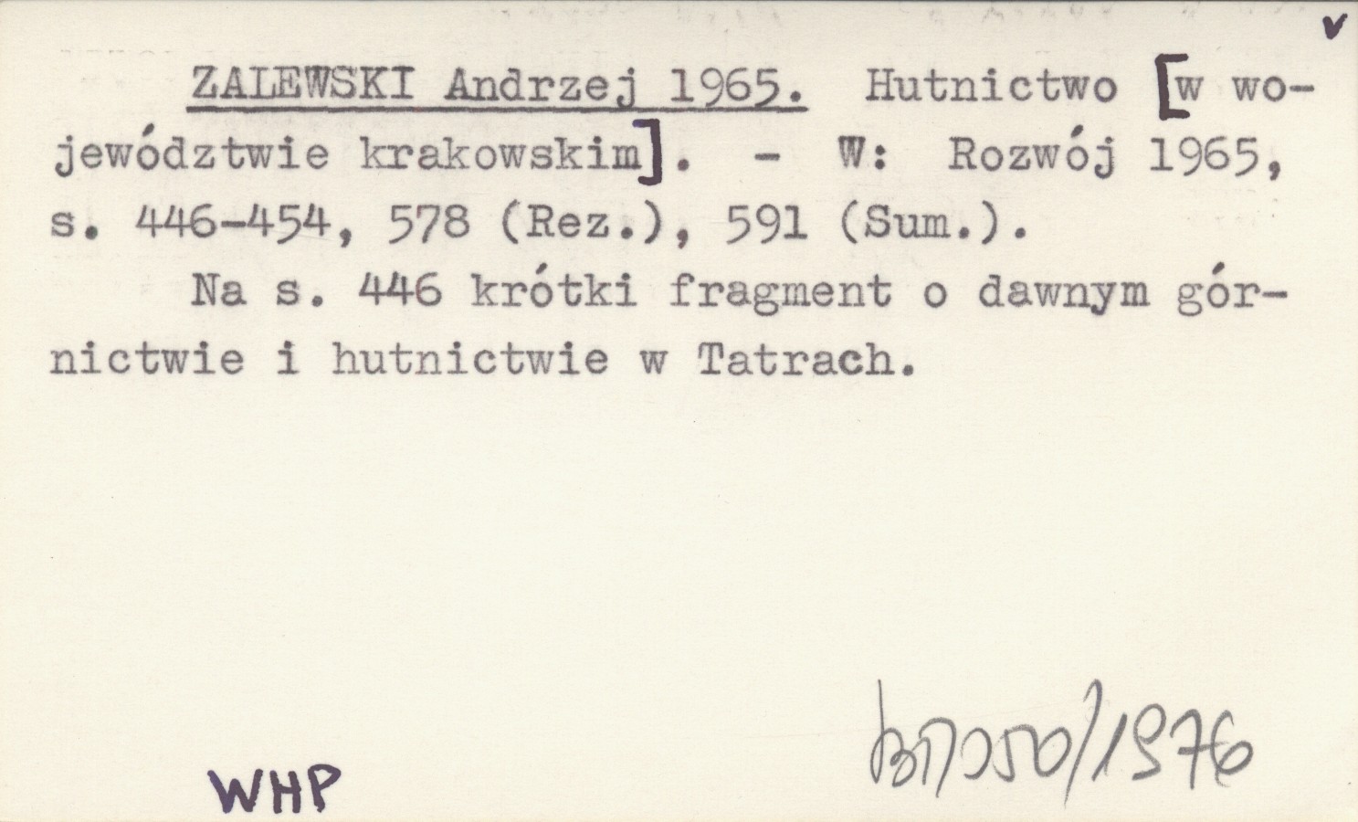 Rozwój 1965 , S. 446-454, 578 (Rez.), 591 (Sum.). Na s. 446 krótki fragment o dawnym górnictwie i hutnictwie w Tatrach.