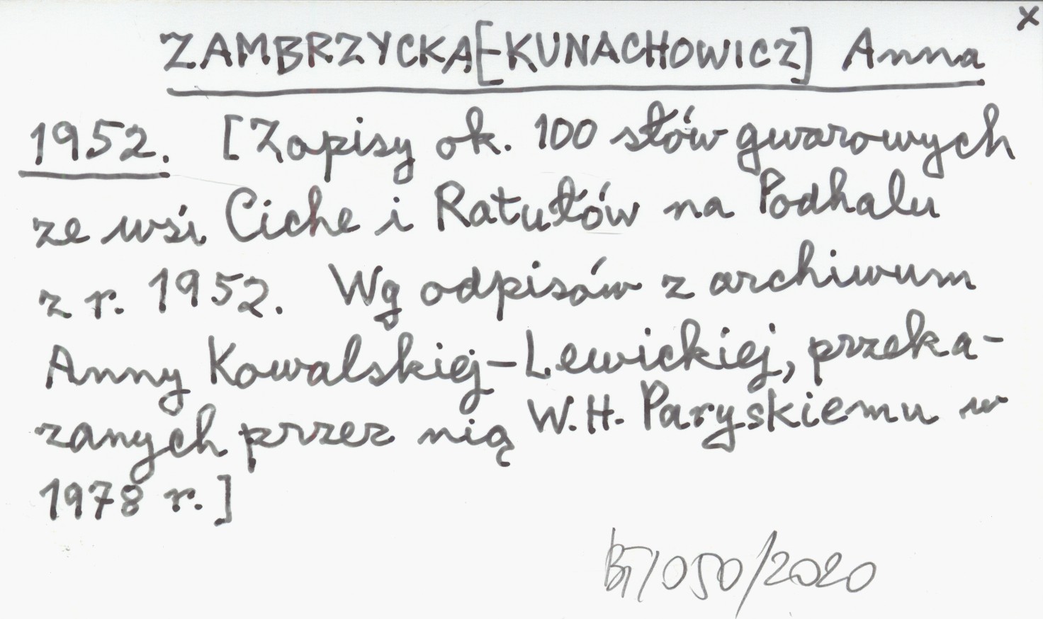 ZAMBRZYCKA[-KUNACHOWICZ] Anna 1952 [Zapisy ok. 100 słów gwarowych ze wsi Ciche i Ratułów na Podhalu z r. 1952. Wg odpisów z archiwum Anny Kowalskiej-Lewickiej,przekazanych przez nią W. H. Paryskiemu w 1978 r.]