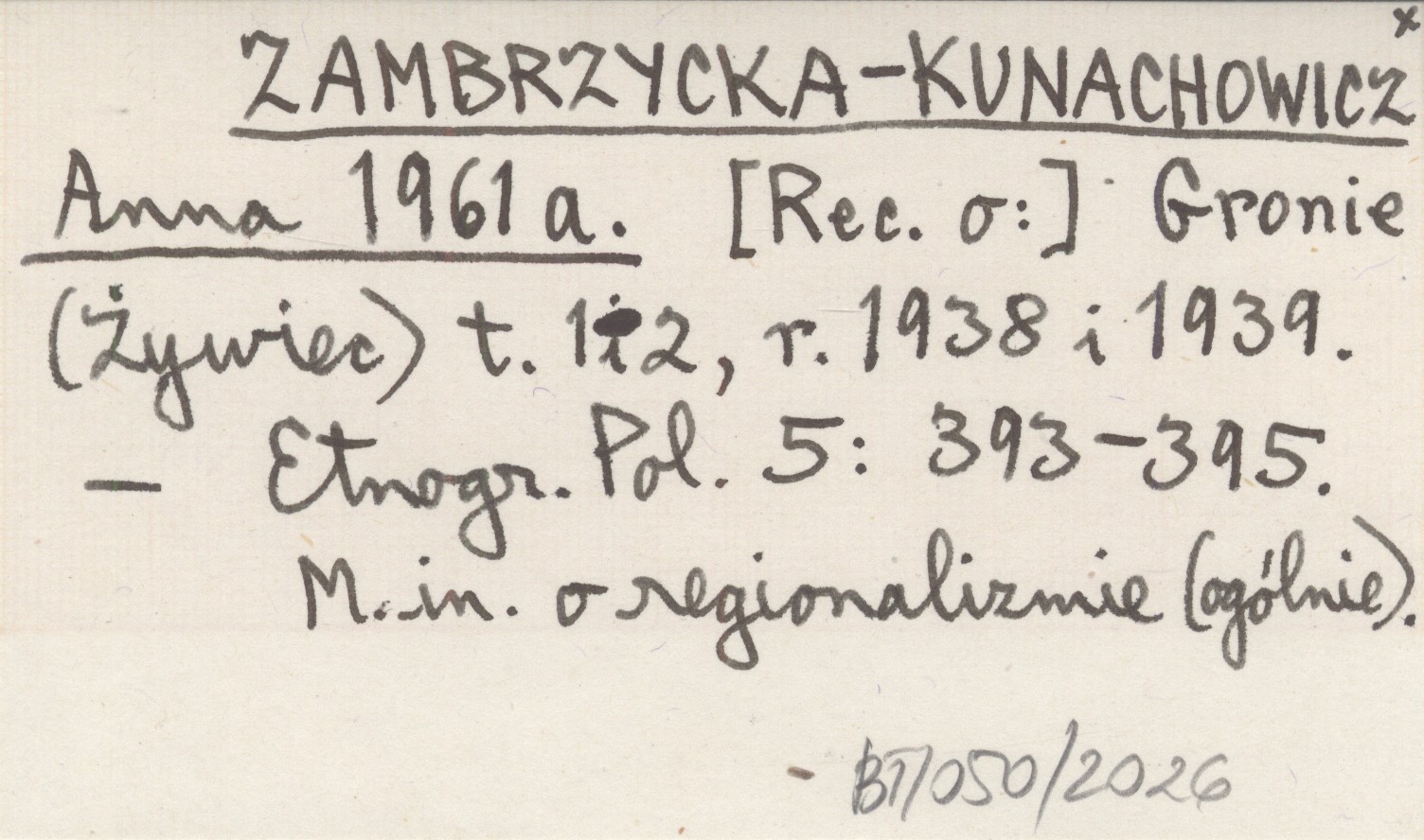 ZAMBRZYCKA-KUNACHOWICZ Anna 1961 a [Rec. o:] Gronie (Żywiec) t. 1-2 (1938 i 1939).