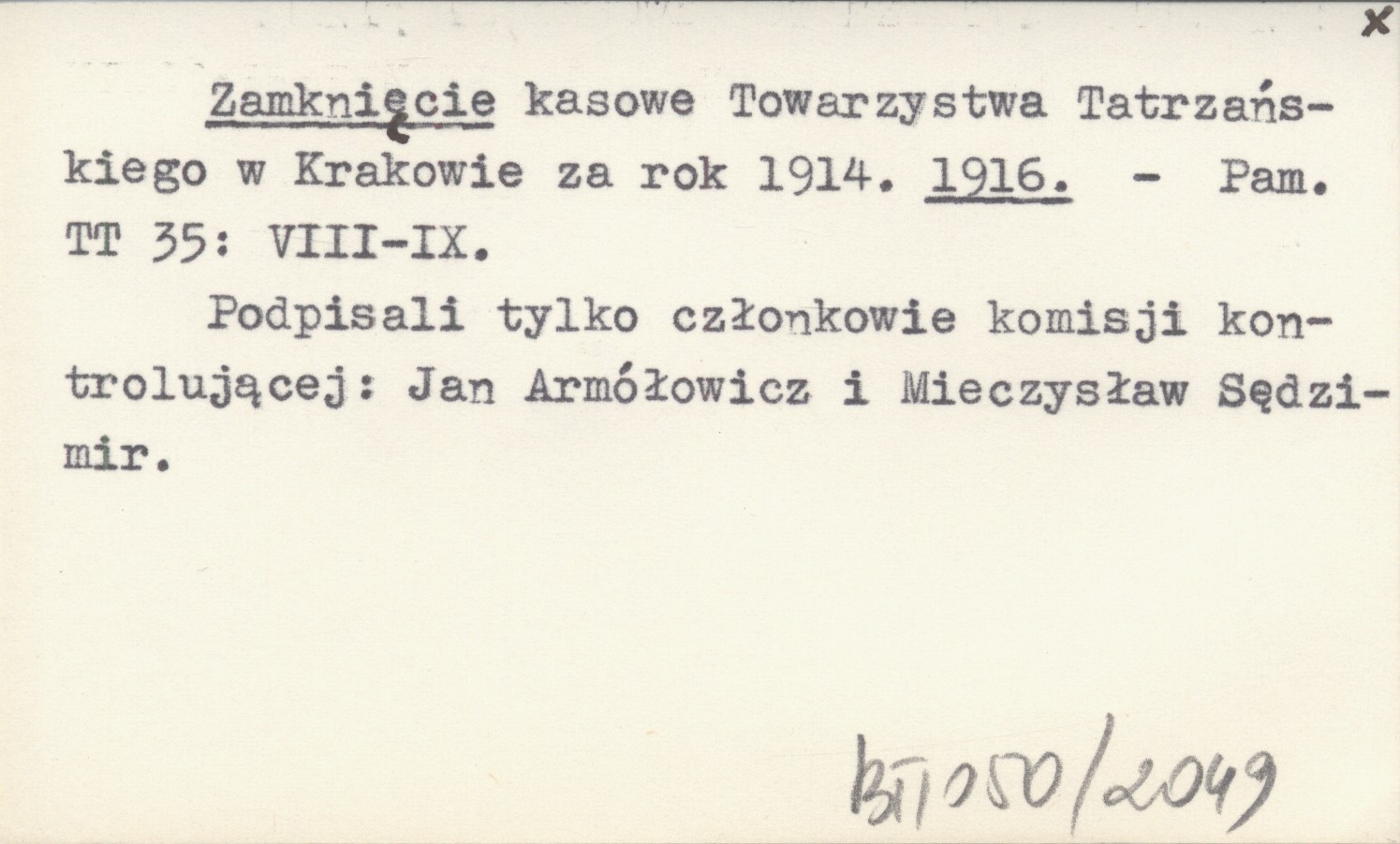 Pamiętnik Towarzystwa Tatrzańskiego, 35: VIII-IX. Podpisali tylko członkowie komisji kontrolującej: Jan Armółowicz i Mieczysław Sędzimir.