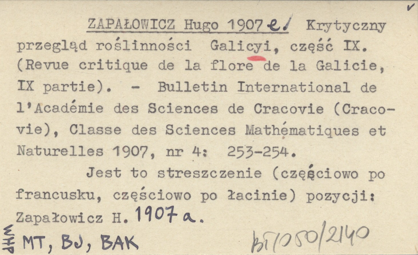 Bulletin International de l'Akadémie Polonaise des Sciences et des Lettres, Classe des Sciences Mathématiques et Naturalles (Cracovie) , 1907, nr 4: 253-254. Jest to streszczenie (częściowo po francusku, częściowo po łacinie) pozycji: ZAPAŁOWICZ H. 1907 a.