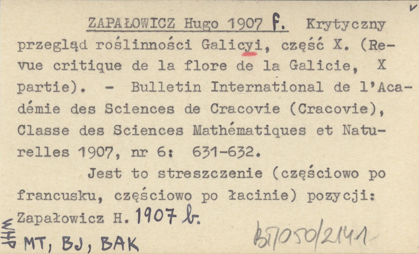 Bulletin International de l'Akadémie Polonaise des Sciences et des Lettres, Classe des Sciences Mathématiques et Naturalles (Cracovie) , 1907, nr 6: 631-632. Jest to streszczenie (częściowo po francusku, częściowo po łacinie) pozycji: ZAPAŁOWICZ H. 1907 b.