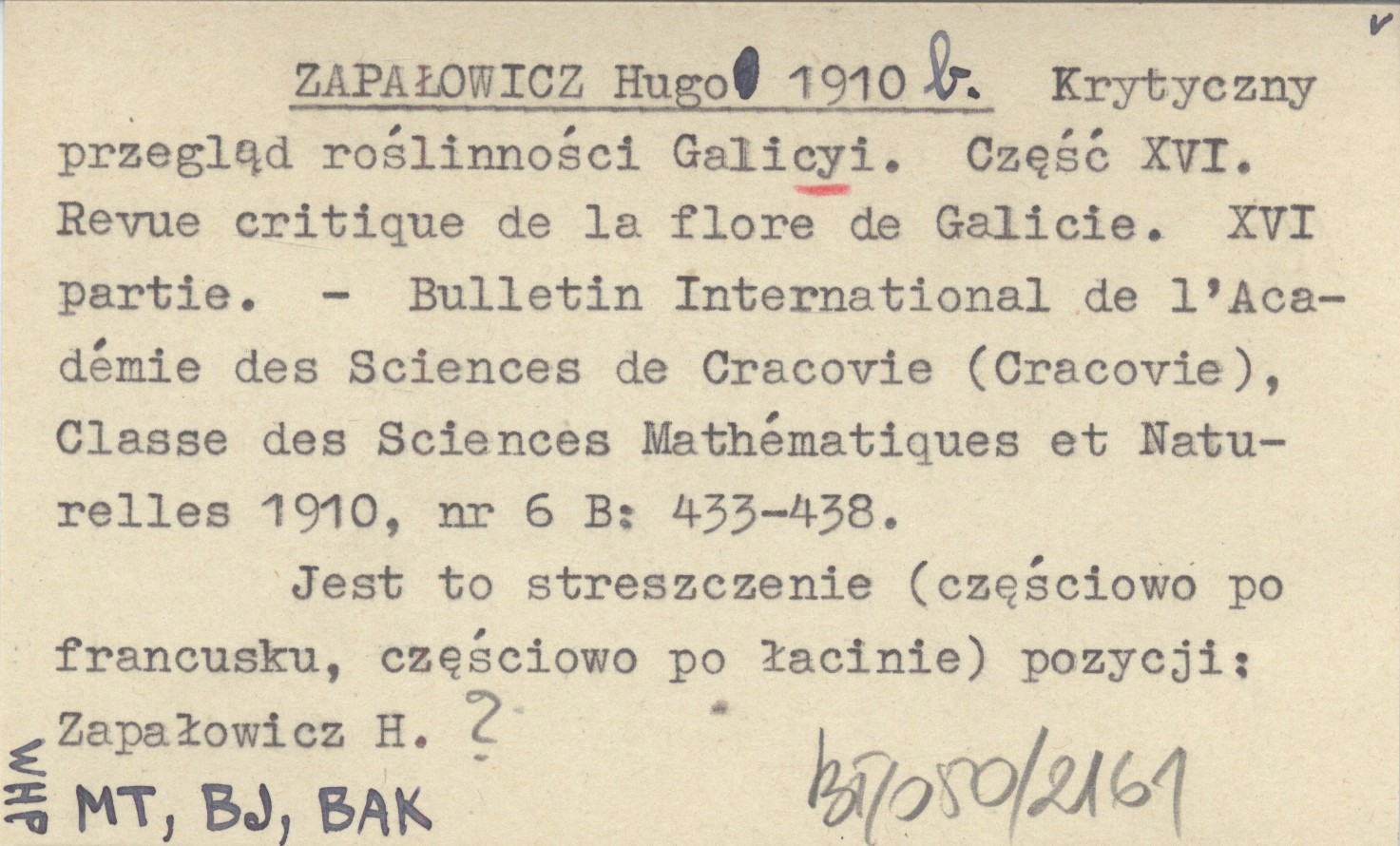 Bulletin International de l'Akadémie Polonaise des Sciences et des Lettres, Classe des Sciences Mathématiques et Naturalles (Cracovie) , 1910, nr 6 B: 433-438. Jest to streszczenie (częściowo po francusku, częściowo po łacinie) pozycji: ZAPAŁOWICZ H. ?