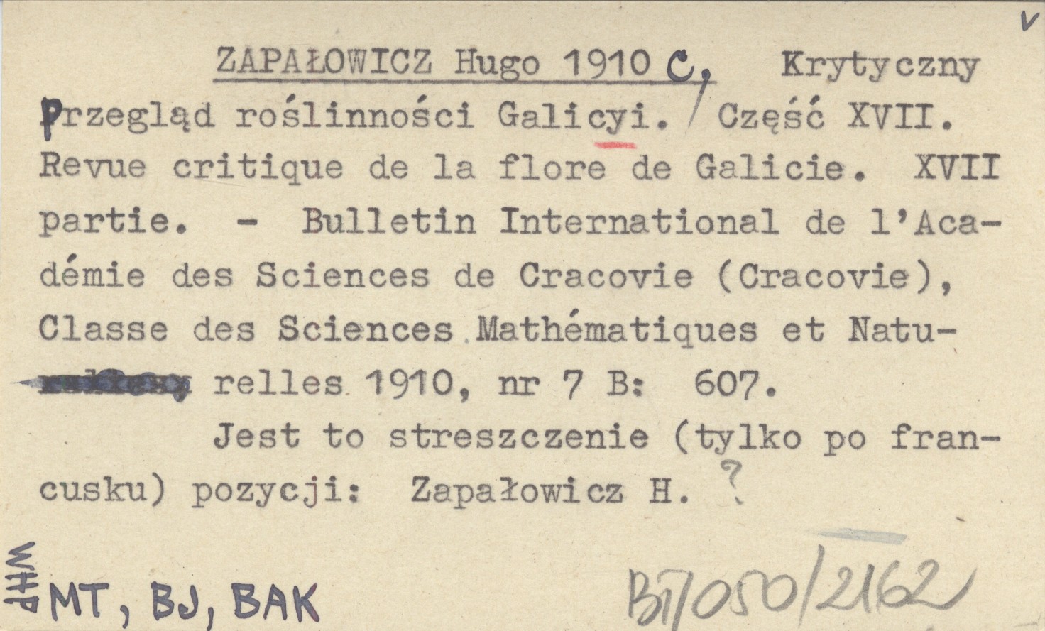 Bulletin International de l'Akadémie Polonaise des Sciences et des Lettres, Classe des Sciences Mathématiques et Naturalles (Cracovie) , 1910, nr 7 B: 607. Jest to streszczenie (tylko po francusku) pozycji: ZAPAŁOWICZ H. ?
