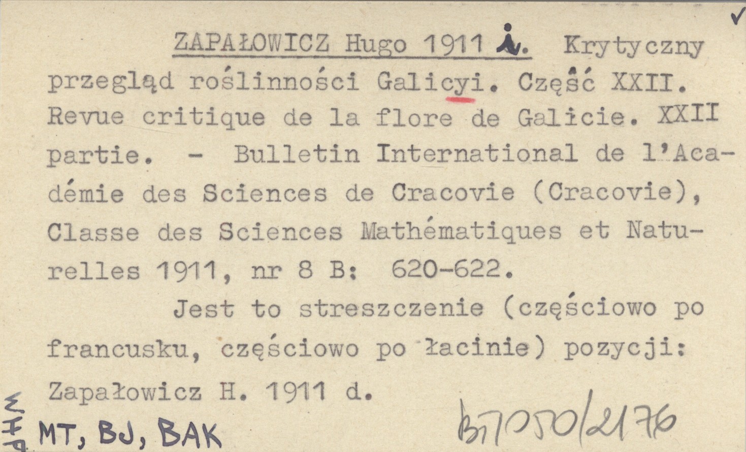 ZAPAŁOWICZ Hugo 1911 i Krytyczny przegląd roślinności Galicyi. Część XXII. Revue critique de la flore de Galicie. XXII partie.