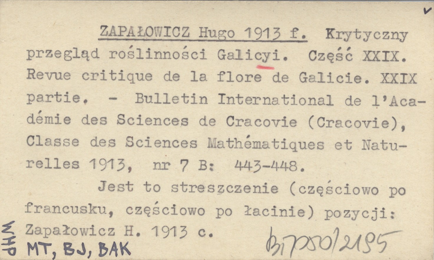 Bulletin International de l'Akadémie Polonaise des Sciences et des Lettres, Classe des Sciences Mathématiques et Naturalles (Cracovie) , 1913, nr 7 B: 443-448. Jest to streszczenie (częściowo po francusku, częściowo po łacinie) pozycji: ZAPAŁOWICZ H. 1913 c.