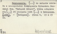 Zaproszenie. [...] do wzięcia udziału w uroczystości Poświęcenia Sztandaru Banderji Tow. "Związek Górali", która odbędzie się [...] 29 sierpnia 1926 [...] w Zakopanem. [1926]