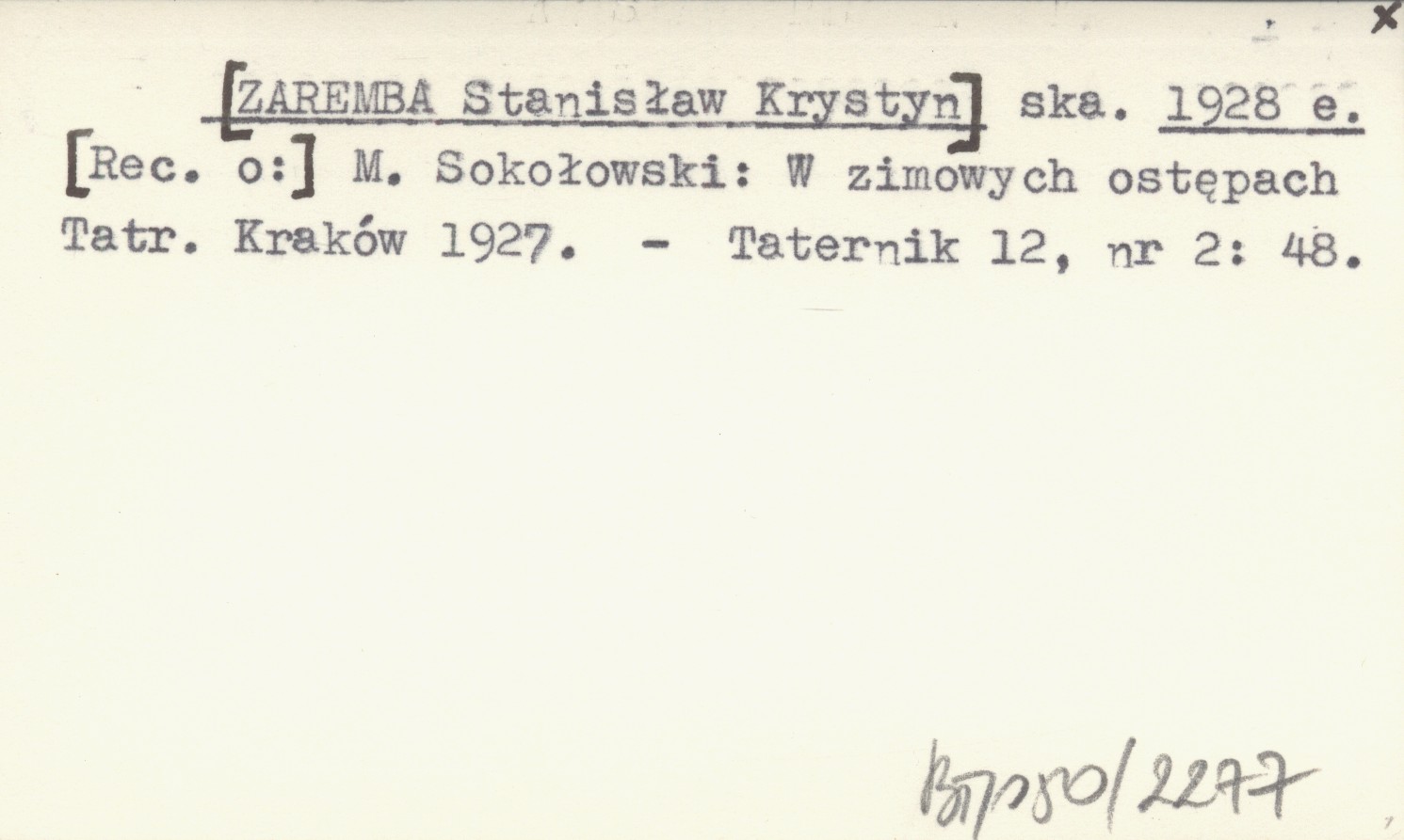 ska. [ZAREMBA Stanisław Krystyn] 1928 a [Rec. o:] M. Sokołowski: W zimowych ostępach Tatr. Kraków 1927.
