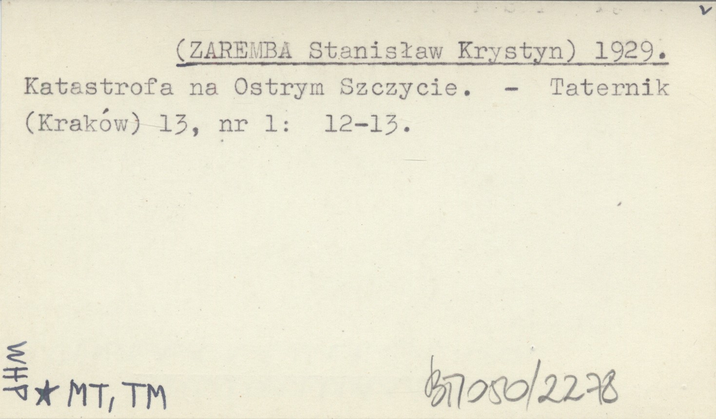 [ZAREMBA Stanisław Krystyn] 1929 Katastrofa na Ostrym Szczycie.