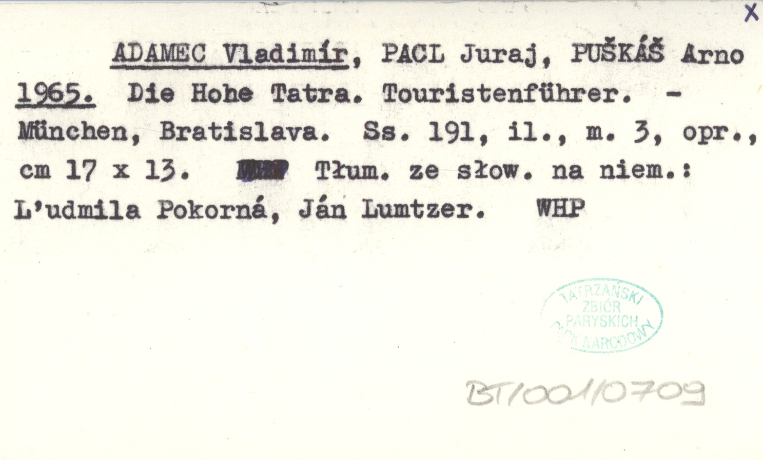 ADAMEC Vladimír PACL, Juraj. ; PUŠKÁŠ, Arno. ; 1965 Die Hohe Tatra. Touristenführer.