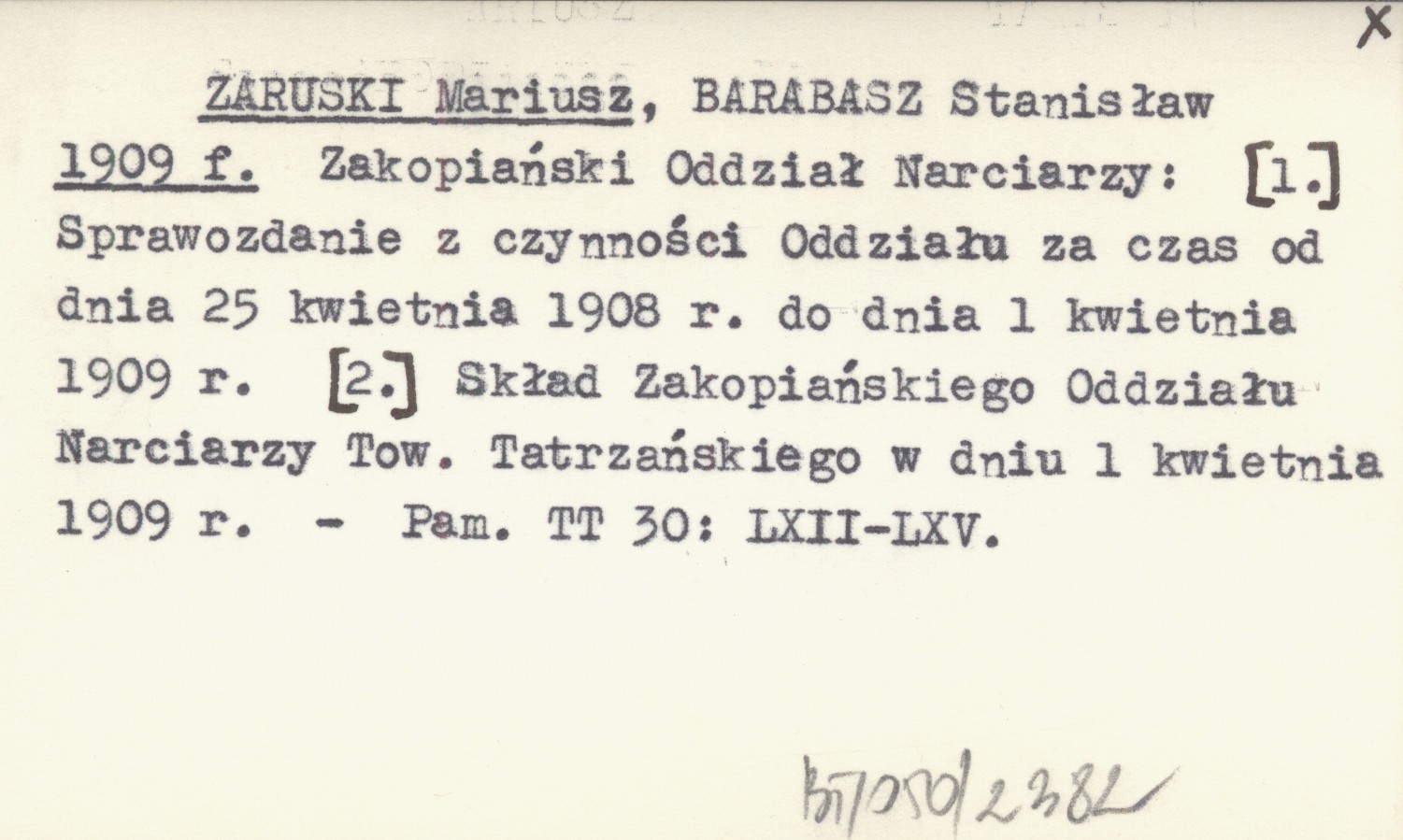 ZARUSKI Mariusz BARABASZ, Stanisław. ; 1909 f Zakopiański Oddział Narciarzy: [1.] Sprawozdanie z czynności Oddziału za czas od dnia 25 kwietnia 1908 r. do dnia 1 kwietnia 1909 r. [2.] Skład Zakopiańskiego Oddziału Narciarzy Tow. Tatrzańskiego w dniu 1 kwietnia 1909 r.