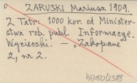 ZARUSKI Mariusz 1909 Z Tatr: 1000 kor. od Ministerstwa rob. publ. Informacye. Wycieczki.