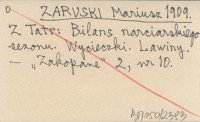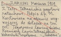 ZARUSKI Mariusz 1909 Z Tatr: Tatrzańskie pogotowie ratunkowe. Podpis ¶.p. M. Karłowicza na odezwie wzywaj±cej do składek na ten cel. Tegoroczne lawiny ¶nieżne. Rozmiary lawin tatrzańskich. Wskazówki turystyczne.