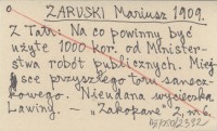 ZARUSKI Mariusz 1909 Z Tatr: Na co powinny być użyte 1000 kor. od Ministerstwa robót publicznych. Miejsce przyszłego toru saneczkowego. Nieudana wycieczka. Lawiny.