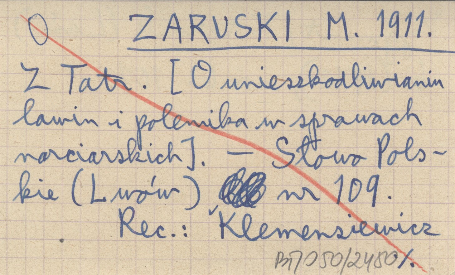 ZARUSKI M. 1911 Z Tatr. [O unieszkodliwianiu lawin i polemika w sprawach narciarskich.]