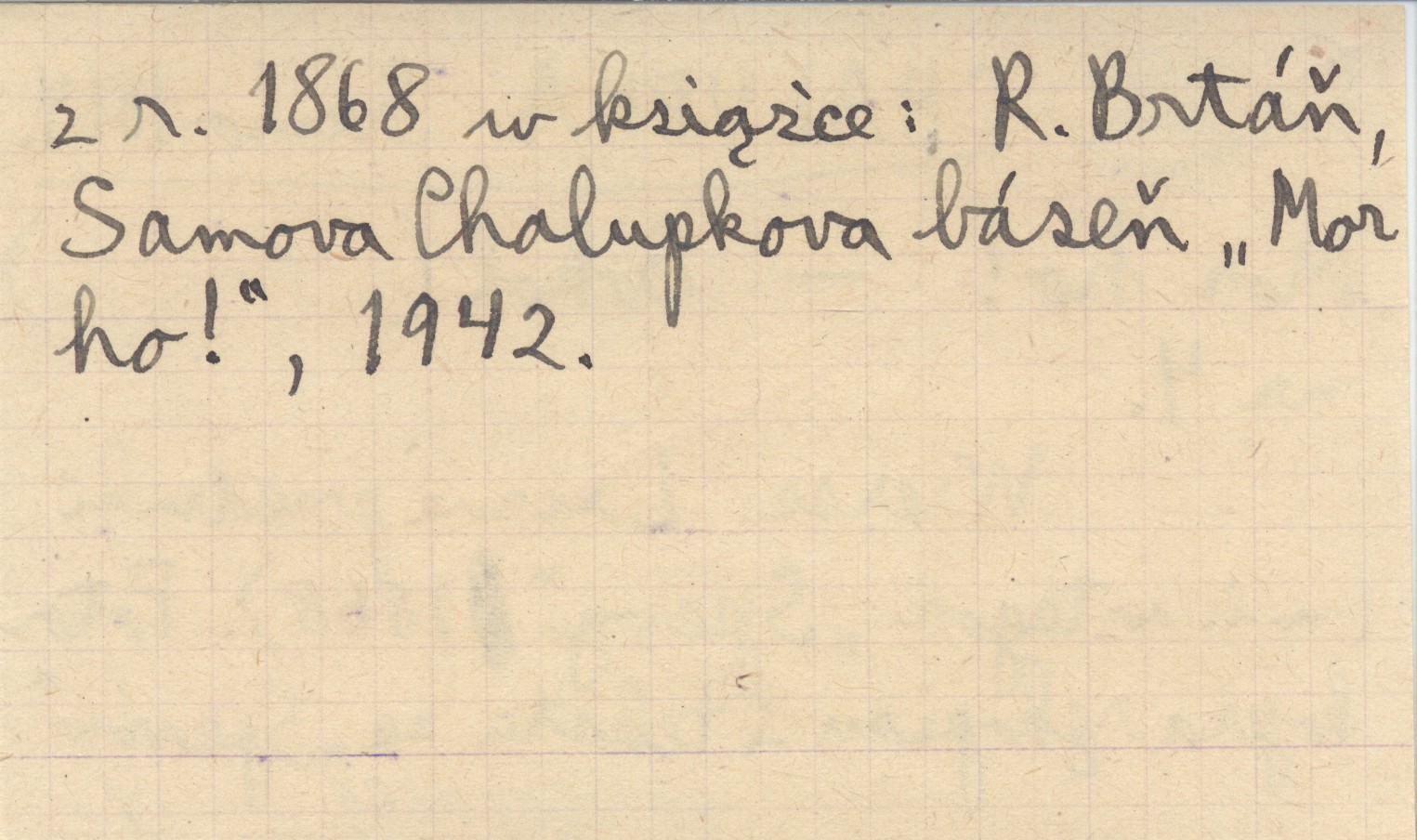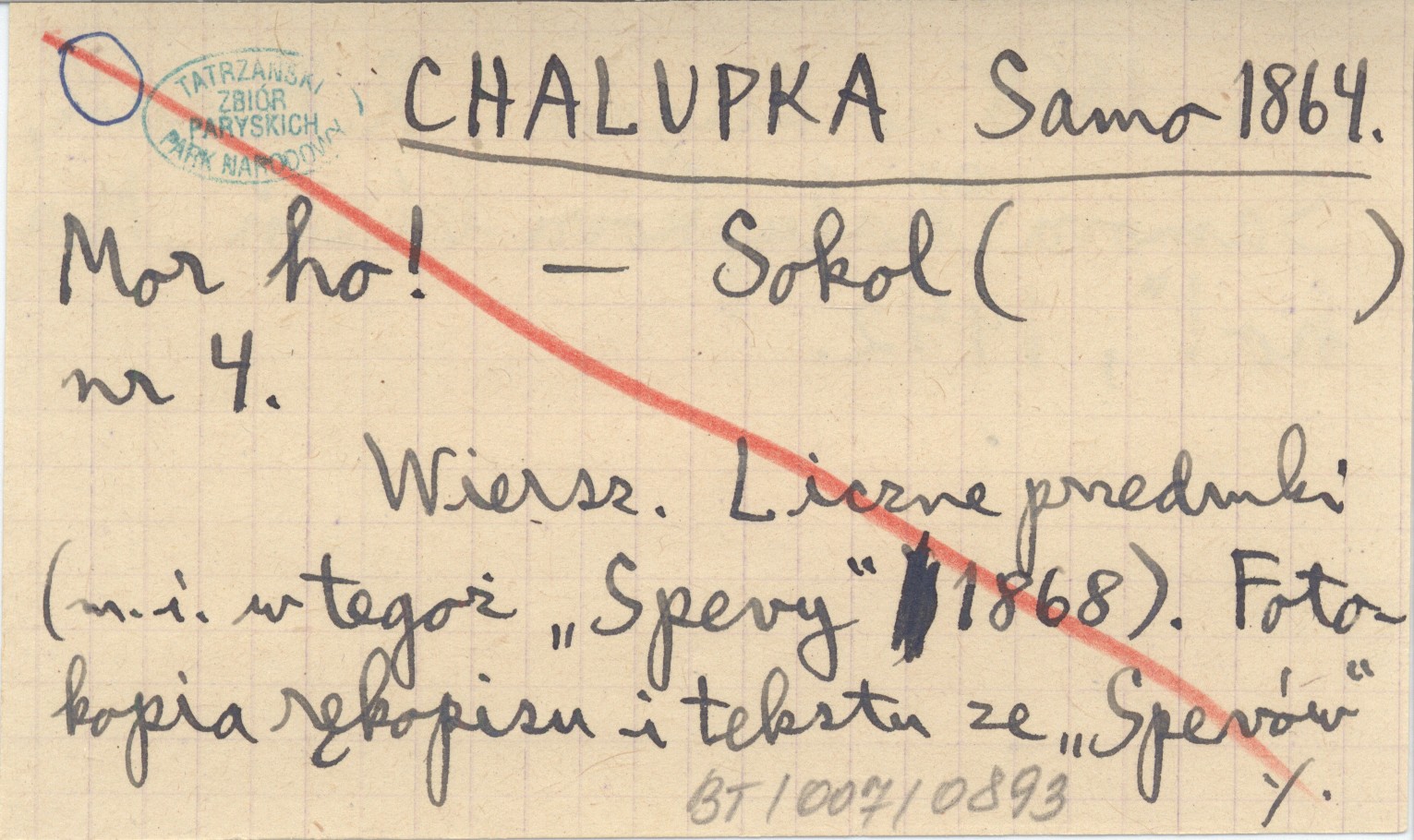 Sokol, Nr 4. Wiersz. Liczne przedruki (m. in. w tegoż "Spevy" 1868). Fotokopia rękopisu i tekstu ze "Spevów" z r. 1868 w książce: R. BRTÁŇ, Samova Chalupkova báseň "Mor ho!", 1942.