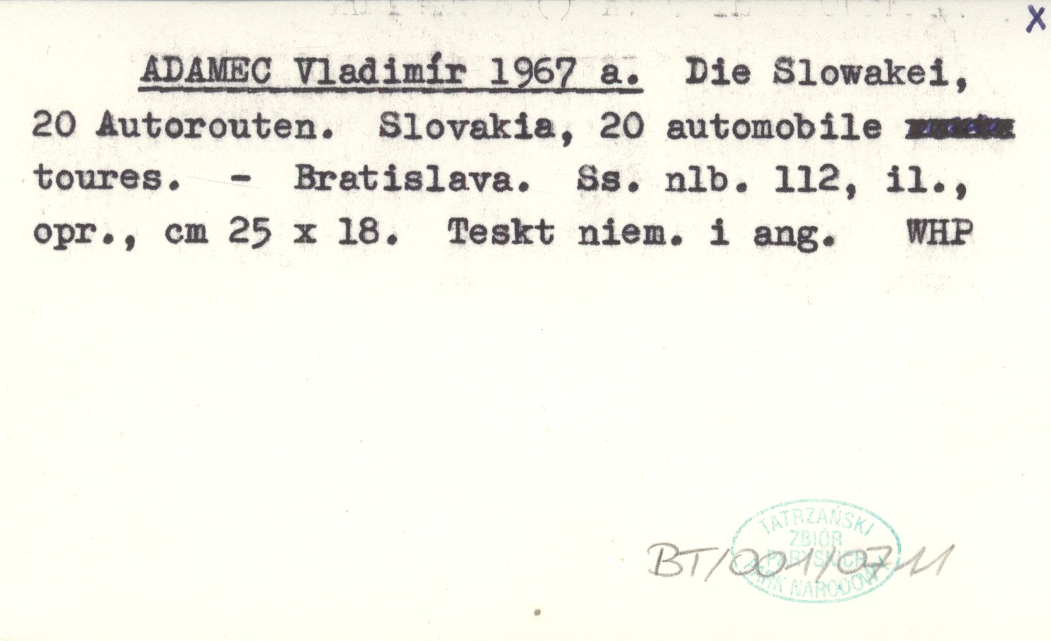 ADAMEC Vladimír 1967 a Die Slowakei, 20 Autorouten. Slovakia, 20 sutomobile toures.