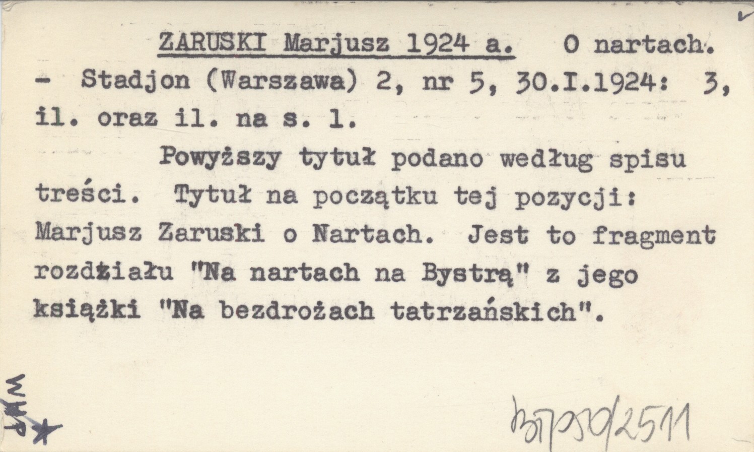 Stadjon (Warszawa) , 2, nr 5 (30 I 1924): 3, il., il. na s. 1. Powyższy tytuł podano według spisu treści. Tytuł na początku tej pozycji: Marjusz Zaruski o Nartach. Jest to fragment rozdziału "Na nartach na Bystrą" z jego książki "Na bezdrożach tatrzańskich".