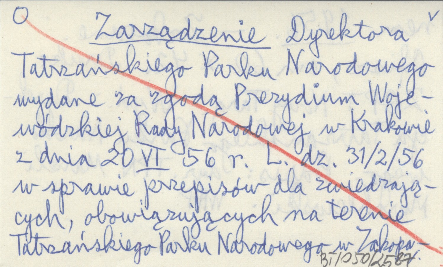 Zarządzenie Dyrektora Tatrzańskiego Parku Narodowego wydane za zgodą Prezydium Wojewódzkiej Rady Narodowej w Krakowie z dnia 20 VI 56 r. L. dz. 31/2/56 w sprawie przepisów dla zwiedzających, obowiązujących na terenie Tatrzańskiego Parku Narodowego w Zakopanem. 1956