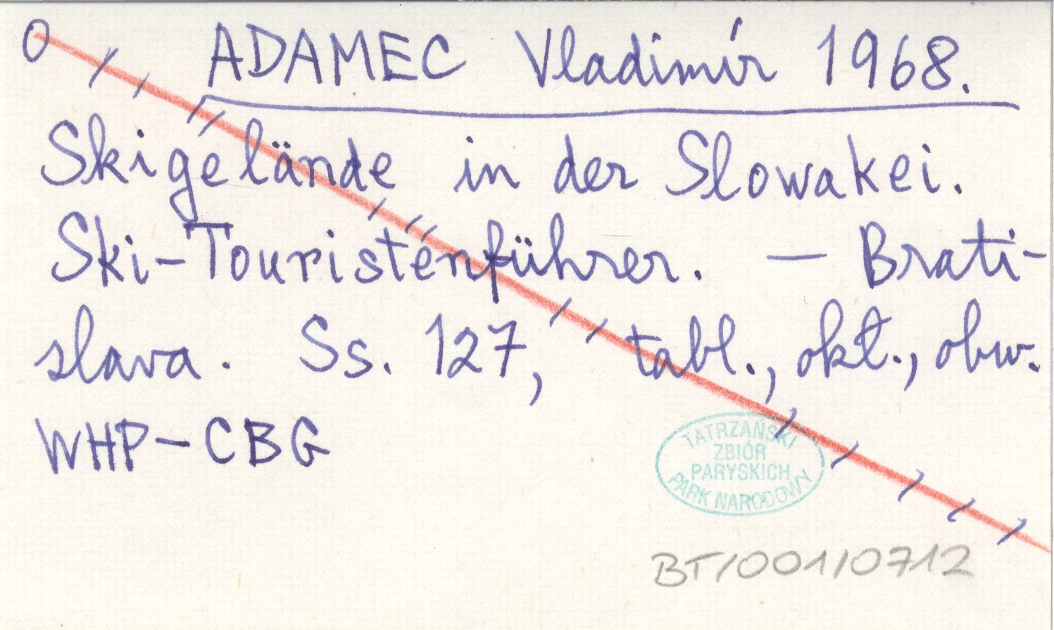 ADAMEC Vladimír 1968 Skigelände in der Slowakei. Ski-Touristenführer.