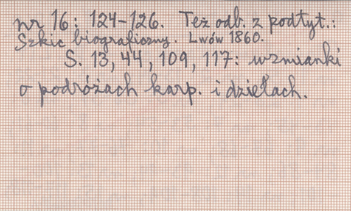 Dziennik Literacki, Nr 1: 5 ; nr 2: 13-14 ; nr 3: 21-22 ; nr 4: 28-29 ; nr 5: 36-37 ; nr 6: 43-45 ; nr 7: 53-54 ; nr 8: 60-61 ; nr 9: 67-68 ; nr 10: 76-77 ; nr 11: 84-86 ; nr 12: 93-94 ; nr 13: 100-101 ; nr 14: 108-109 ; nr: 15: 117-118 ; nr 16: 124-126. S. 13, 44, 109, 117: wzmianki o podróżach karpackich i dziełach. Też odb. z podtytułem: Szkic biograficzny. Lwów 1860.