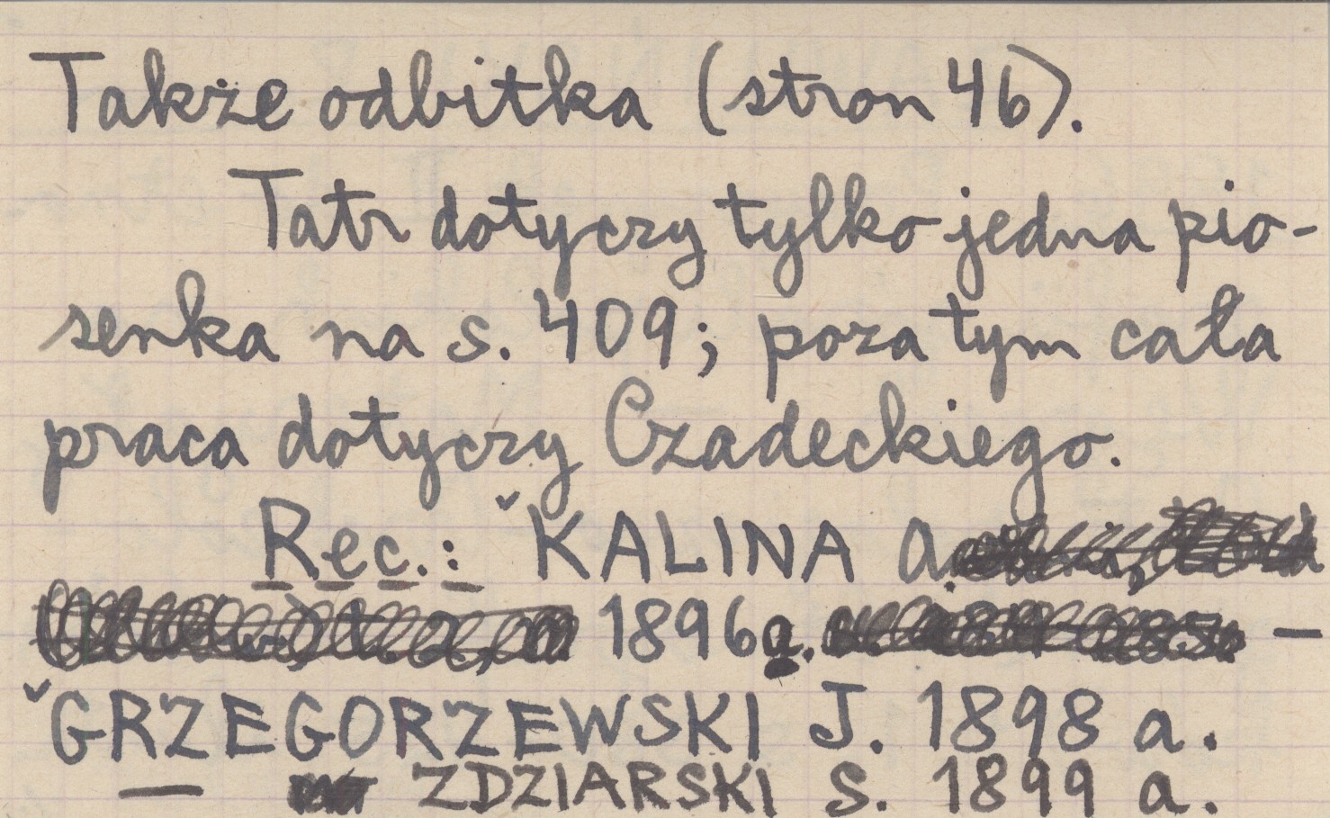 Materyały Antropologiczno-Archeologiczne i Etnograficzne (Kraków) , T. 1: 380-425, il. Tatr dotyczy tylko jedna piosenka na s. 409, poza tym cała praca dotyczy Czadeckiego. Także odbitka (46 s.). REC: KALINA A. 1896 a ; GRZEGORZEWSKI J. 1898 a ; ZDZIARSKI S. 1899 a ;