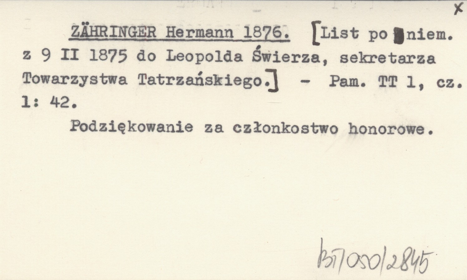 ZÄHRINGER Hermann 1876 [List po niem. z 9 II 1875 do Leopolda Świerza, sekretarza Towarzystwa Tatrzańskiego.]