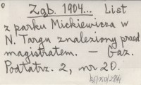 Z±b. 1904... List z parku Mickiewicza w N. Targu znaleziony przed magistratem.